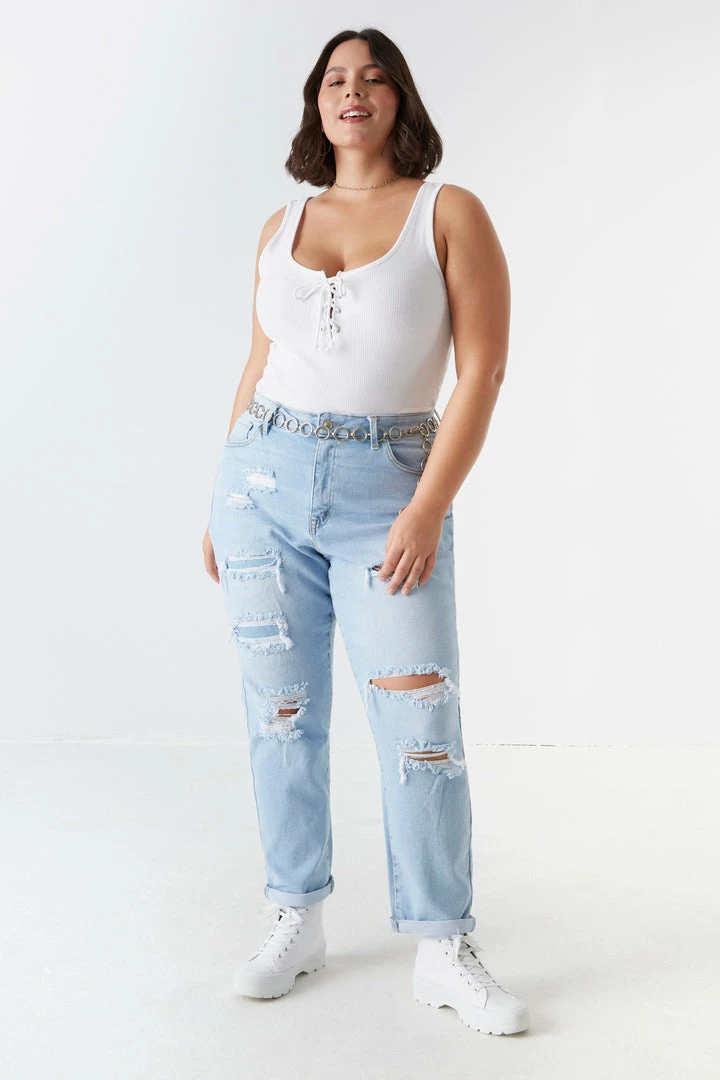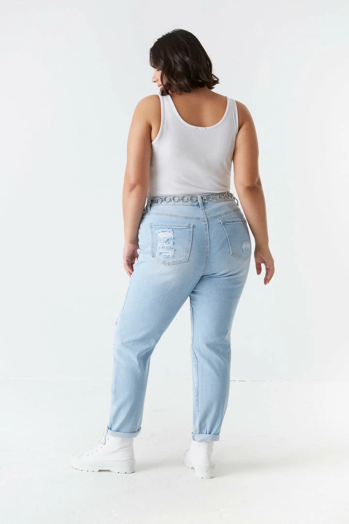 Our love for fierce denim never fades. Conquer everyday with this flattering fit! This jean features zip-fly front closure, all over distressing, bleached denim, rolled cuffs, belt loops and five pockets.
