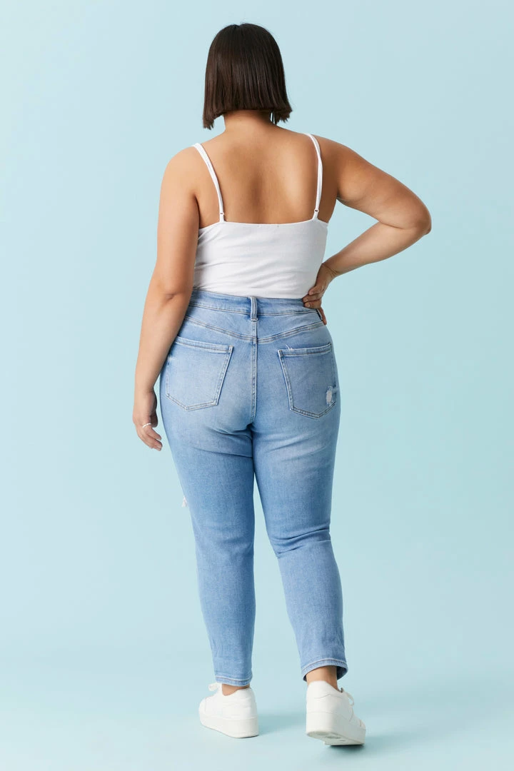 Don’t fade into the background! Stand out in denim that fits like a dream. This jean features distressing, light wash, zip-fly button-up closure, boyfriend fit, five pockets and belt loops.