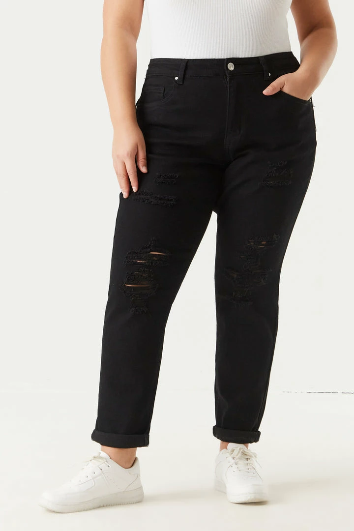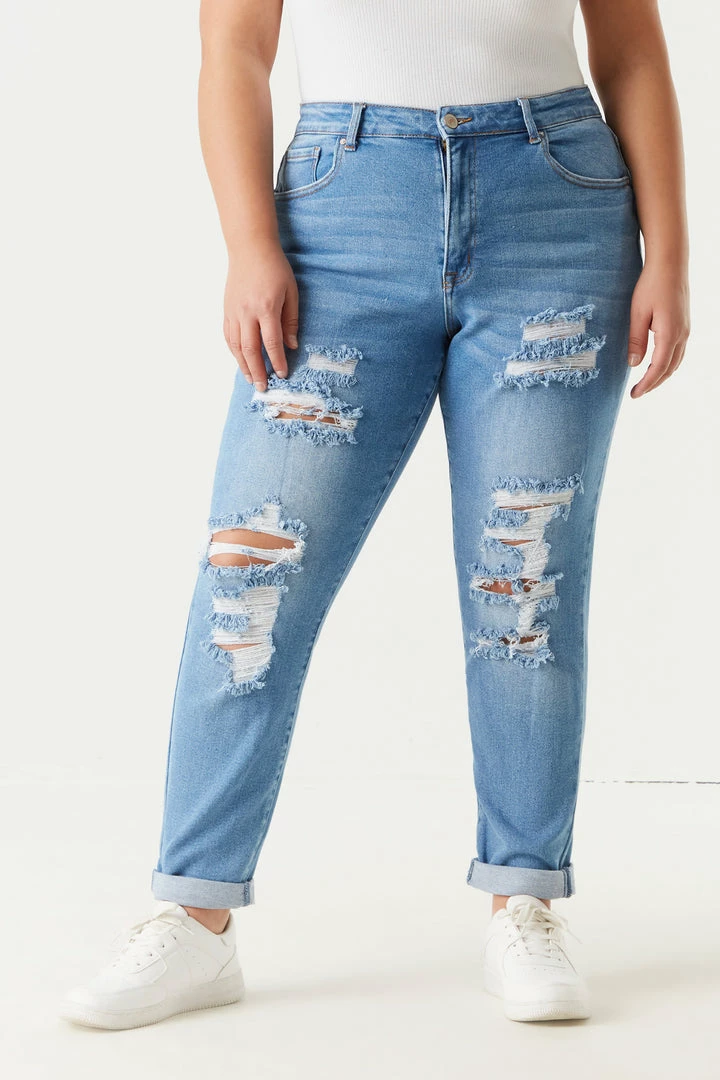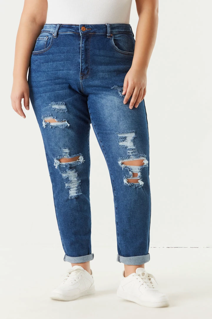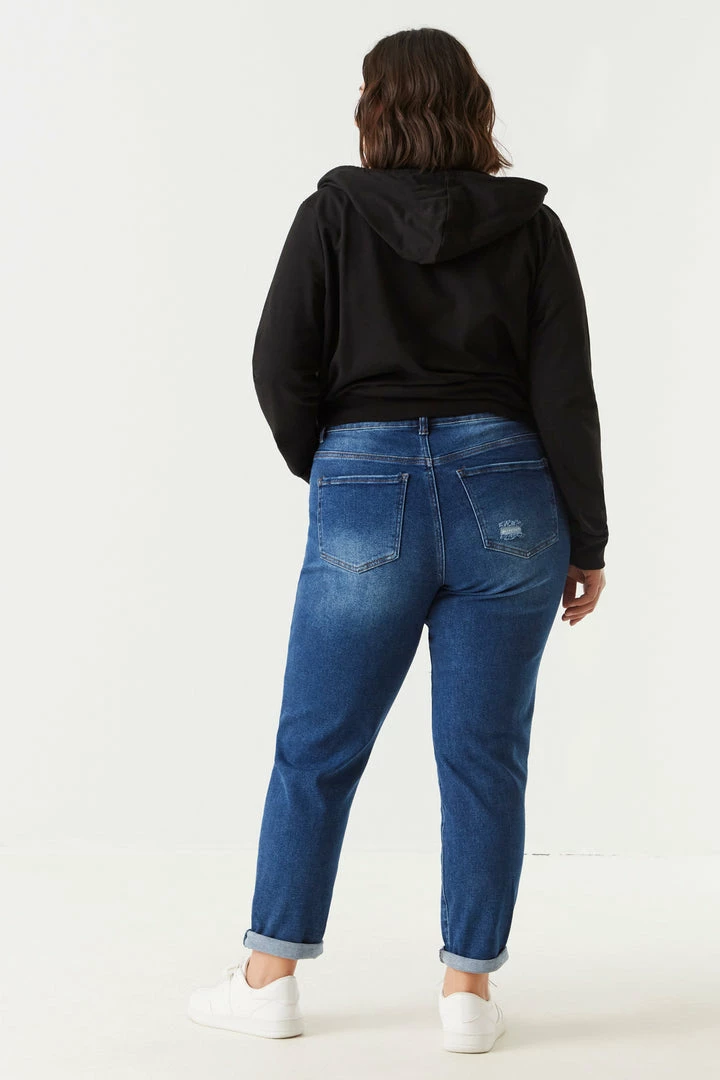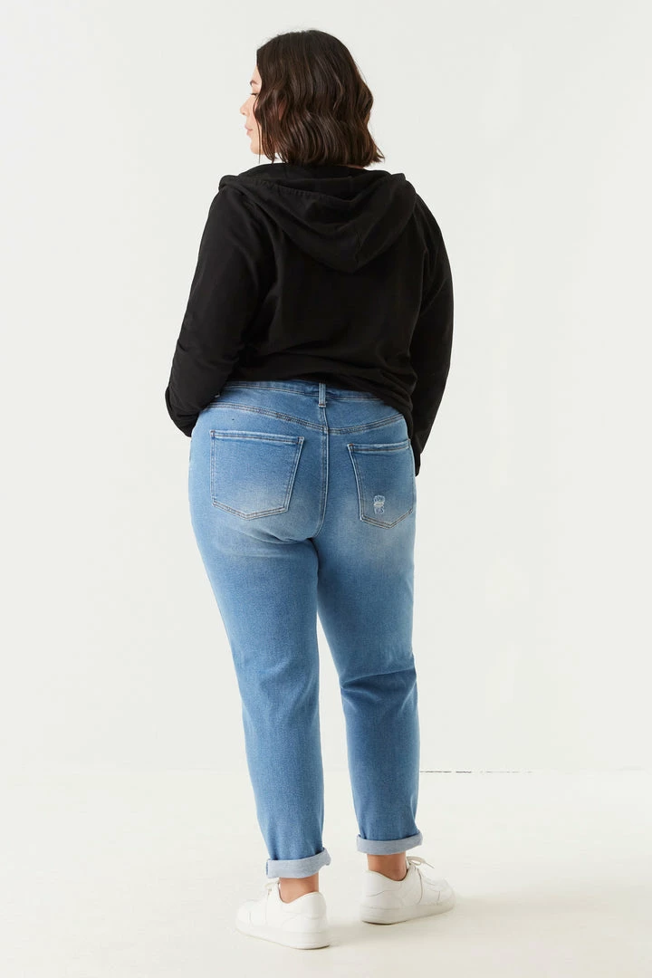 Pair up with this dream date denim and experience the real perks of a boyfriend fit. This jean features high-rise waist, all over distressing, five pockets, zip-fly button-up closure, boyfriend fit, rolled hem and belt loops.