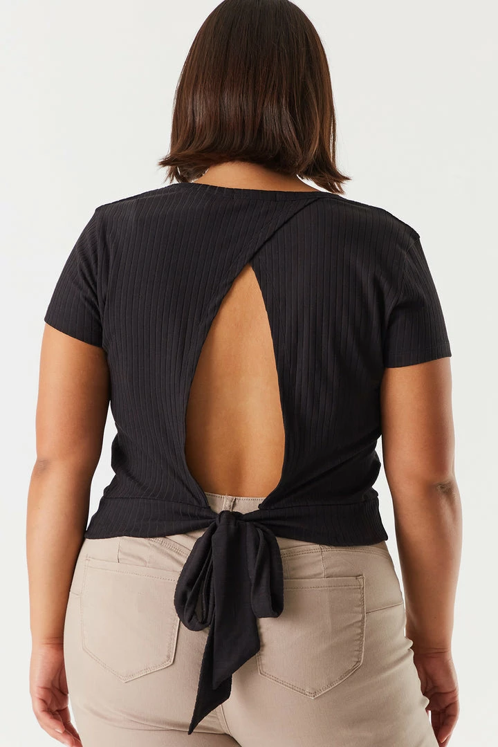 Business in the front, party in the back baby! This top features a soft ribbed material, short sleeves and an open back design with self-tie details.