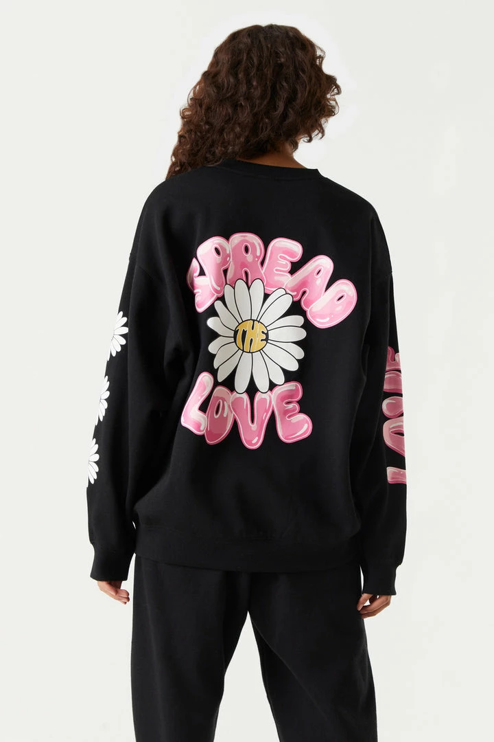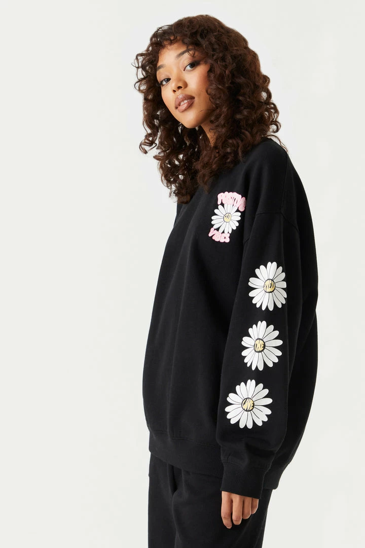 We are positive you’ll fall in love with the good vibes this sweatshirt guarantees. This sweatshirt features crew neckline, sleeve and front chest graphic, oversized fit and ribbed knit cuffs. Size runs small.