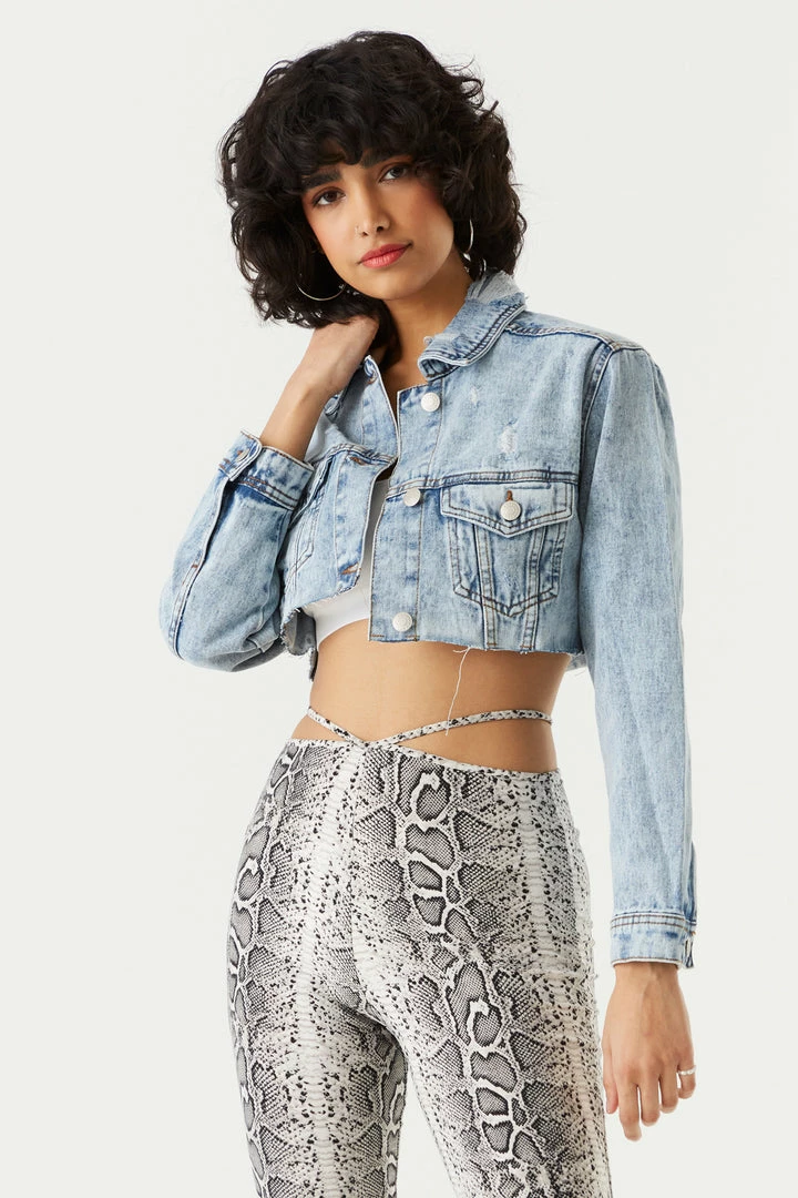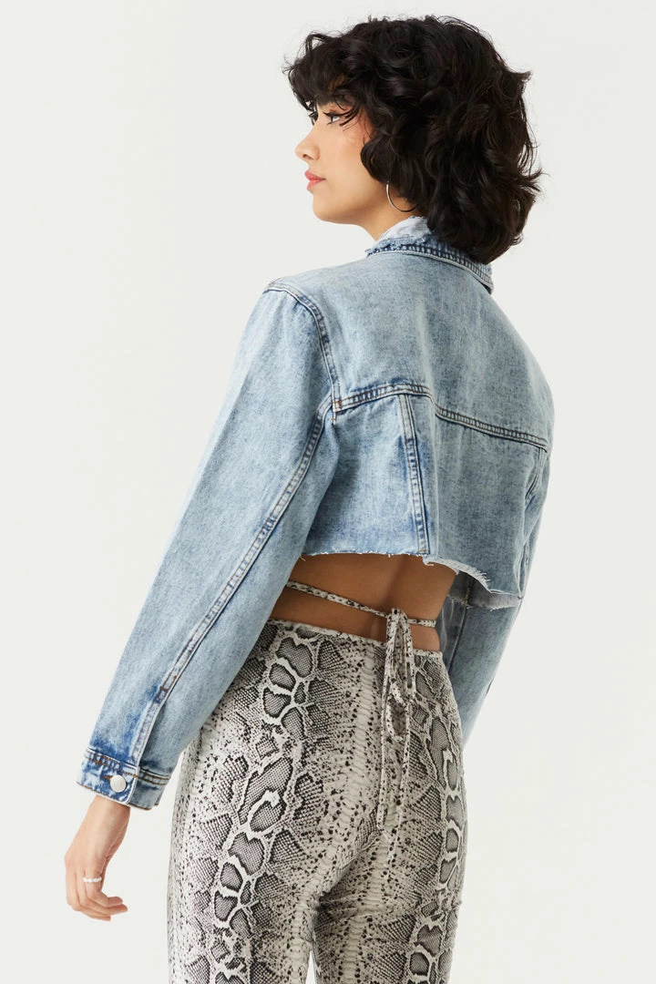 We’ve been dreaming of this jean-ie jacket! Make all your cropped wishes come true in a fire fit that is sure to turn heads. This jacket features all over distressing, cropped fit, two front chest pockets, collar, buttoned cuffs and three button-up front. Size Runs Small.