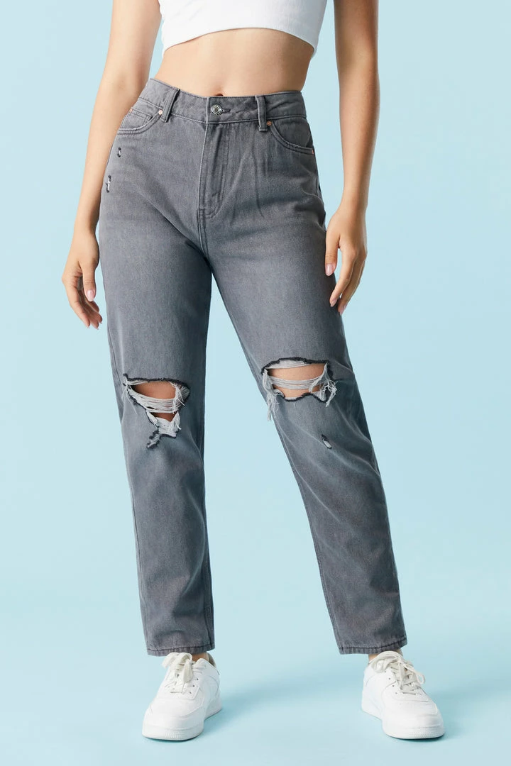 Jeans for the everyday adventures. When you look this good, who knows where the day will take you. This jean features gray wash, mom fit, distressing, five pockets, belt loops and zip-fly button-up closure.