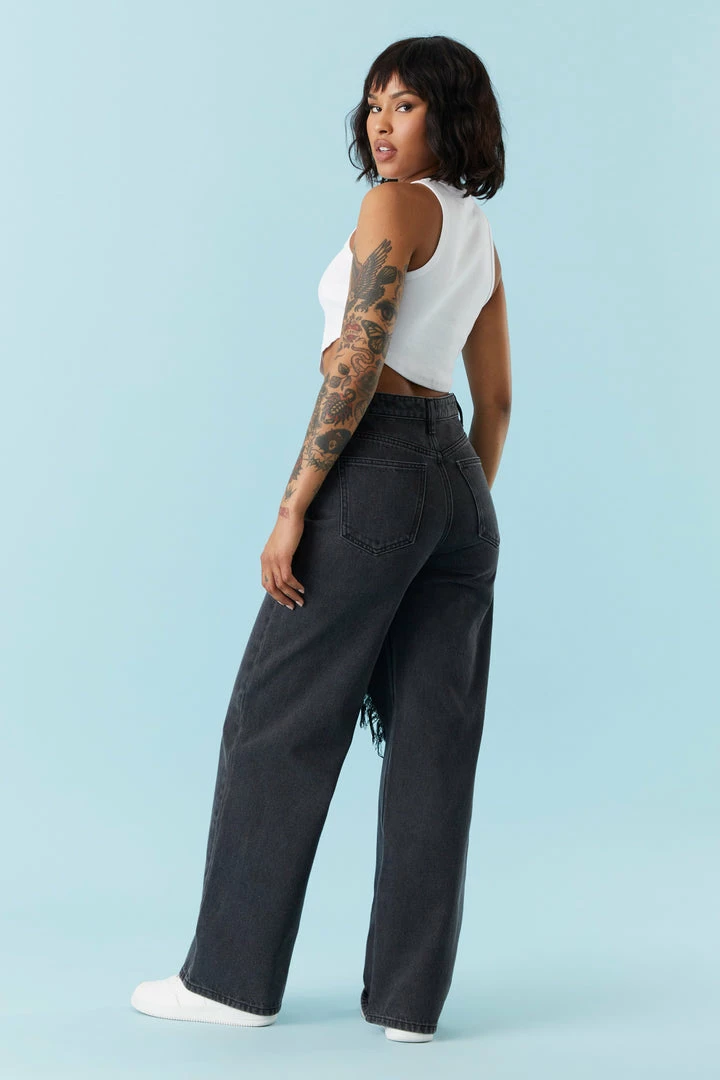 Send your skinnies packing! There’s a new fire fit in town. This jean features zip-fly button-up closure, loose leg, light distressing, high-rise waist, five pockets and belt loops.