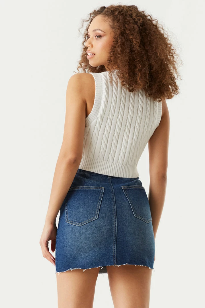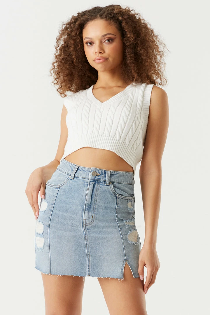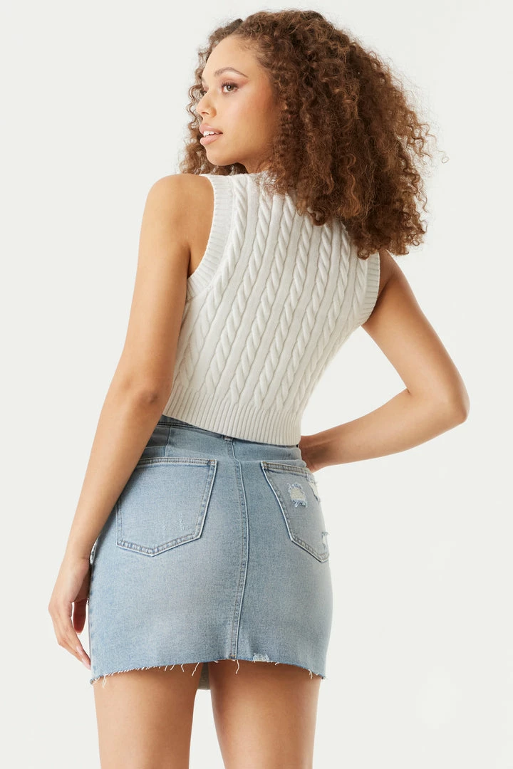 Get that classic blue-jean-baby look with this throwback fit. This skirt features all over distressing, mini left leg slit, zip-fly button closure, belt loops, raw hem, high-rise waist, four pockets and light denim wash. Size Runs Small.