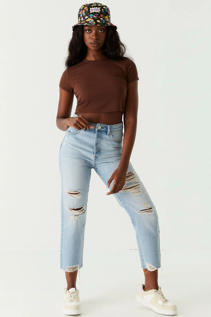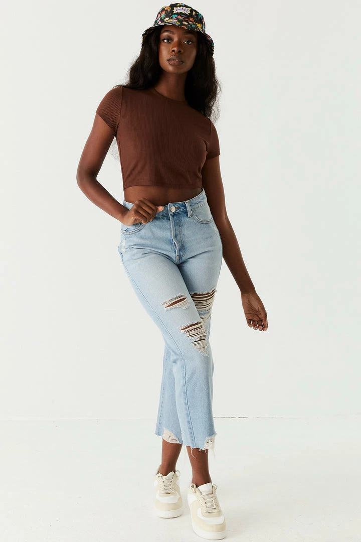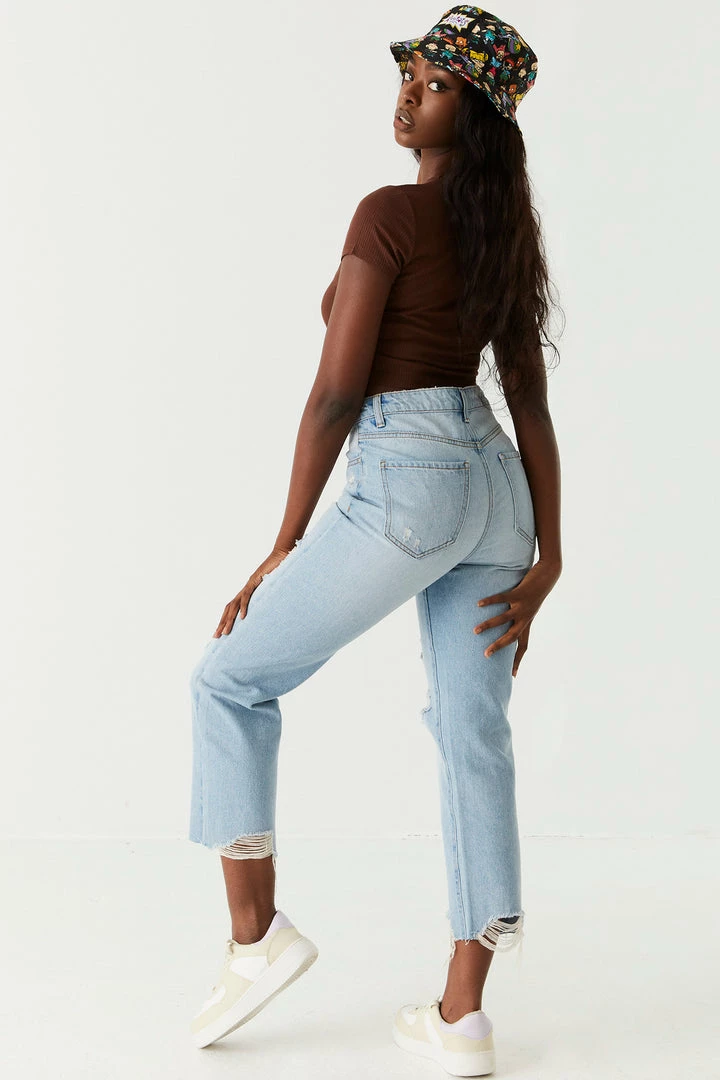 A true 90’s throwback feel! The straight jean is a crowd-fave with its classic old-school slender fit and a figure-flattering high-rise waist. This jean also features a zip fly closure, belt loops, distressing and five pockets. NOTE: This pair of jeans runs larger than our regular fits. We recommend ordering one size down for the perfect fit.