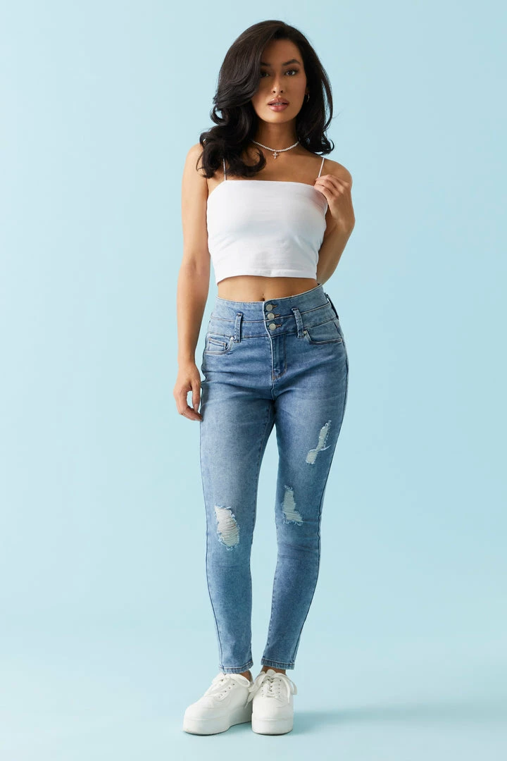 Treat your peach! Push-up jeans are your bottoms new best friend. This jean features high-rise waist, zip-fly button-up closure, five pockets, push-up fit, skinny leg, light distressing and medium wash.