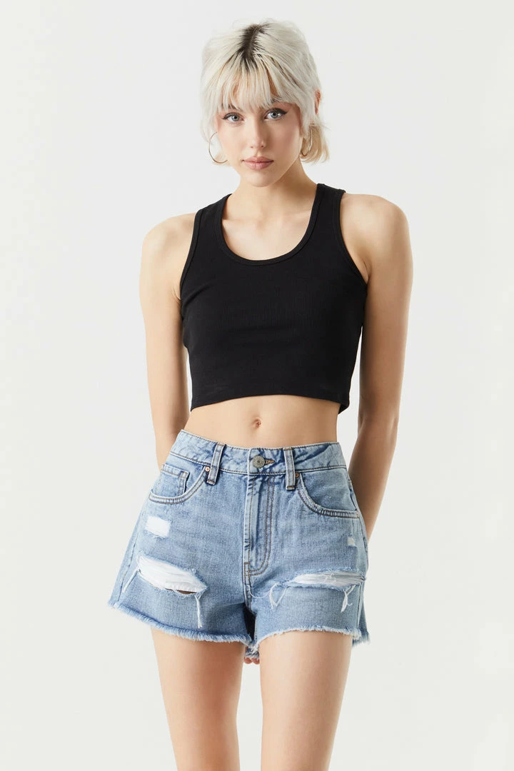 Strut into summer in style with this vintage fit. This short features zip-fly button-up closure, five pockets, distressing, raw hem, high-rise waist, medium wash and vintage fit.