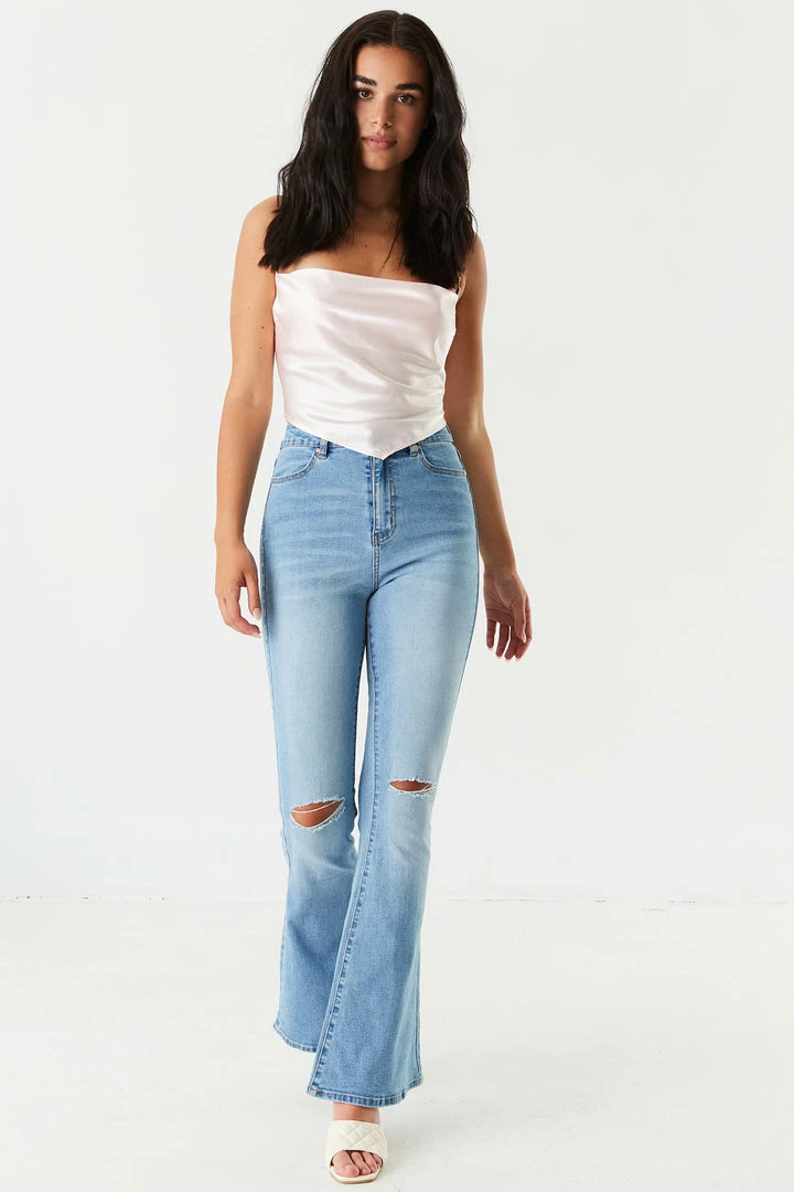 Got a flare for the dramatics? Our flare jean features a high-rise fit that is slim through the thigh with a toned down flare leg. This jean also features a zip fly closure, belt loops and five pockets. Size Runs Small.
