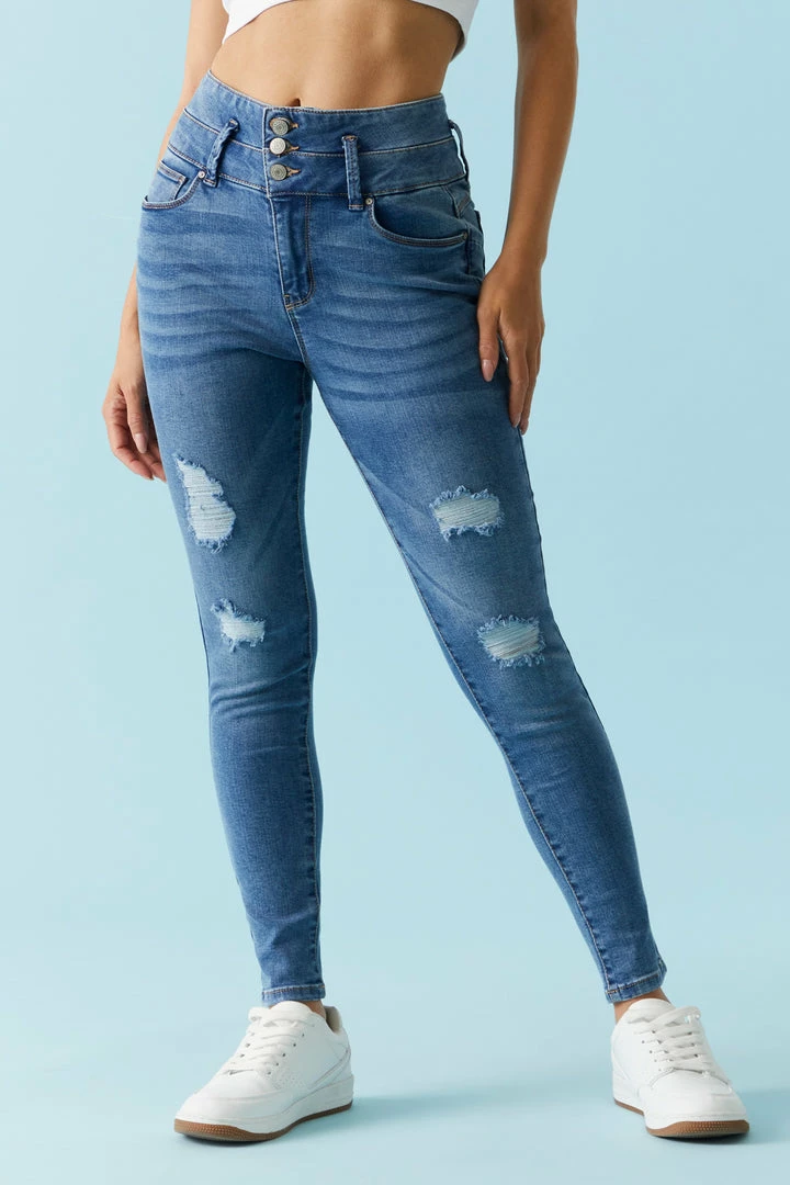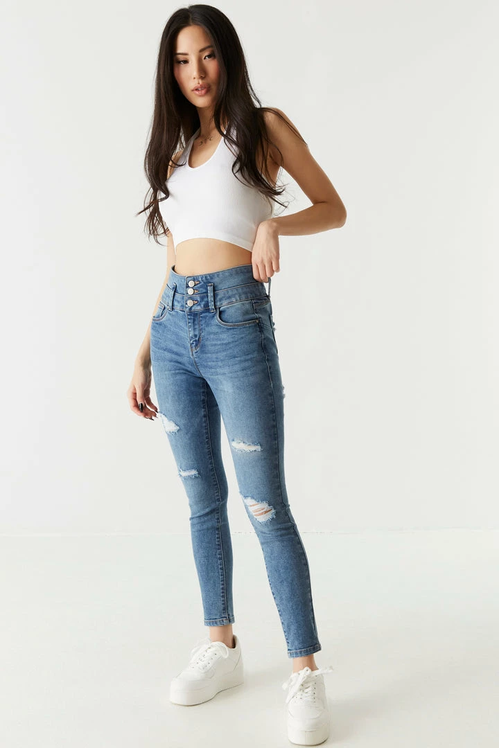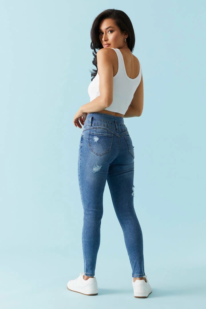 A pair of jeans a day keeps the bad vibes away! This jean features high-rise waist, zip-fly button-up closure, five pockets, push-up fit, skinny leg, light distressing and dark wash.