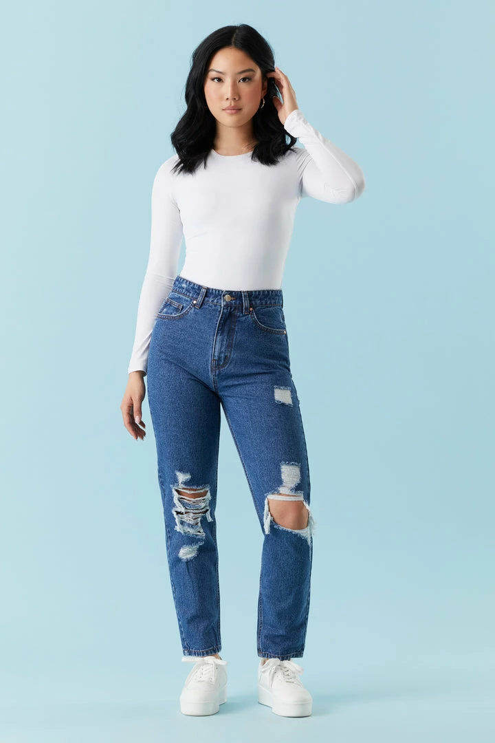 These aren’t your regular mom jeans, their a cool mom jean. This jean features mom fit, ultra-high-rise waist, dark wash, distressing, zip-fly button-up closure, belt loops and five pockets.