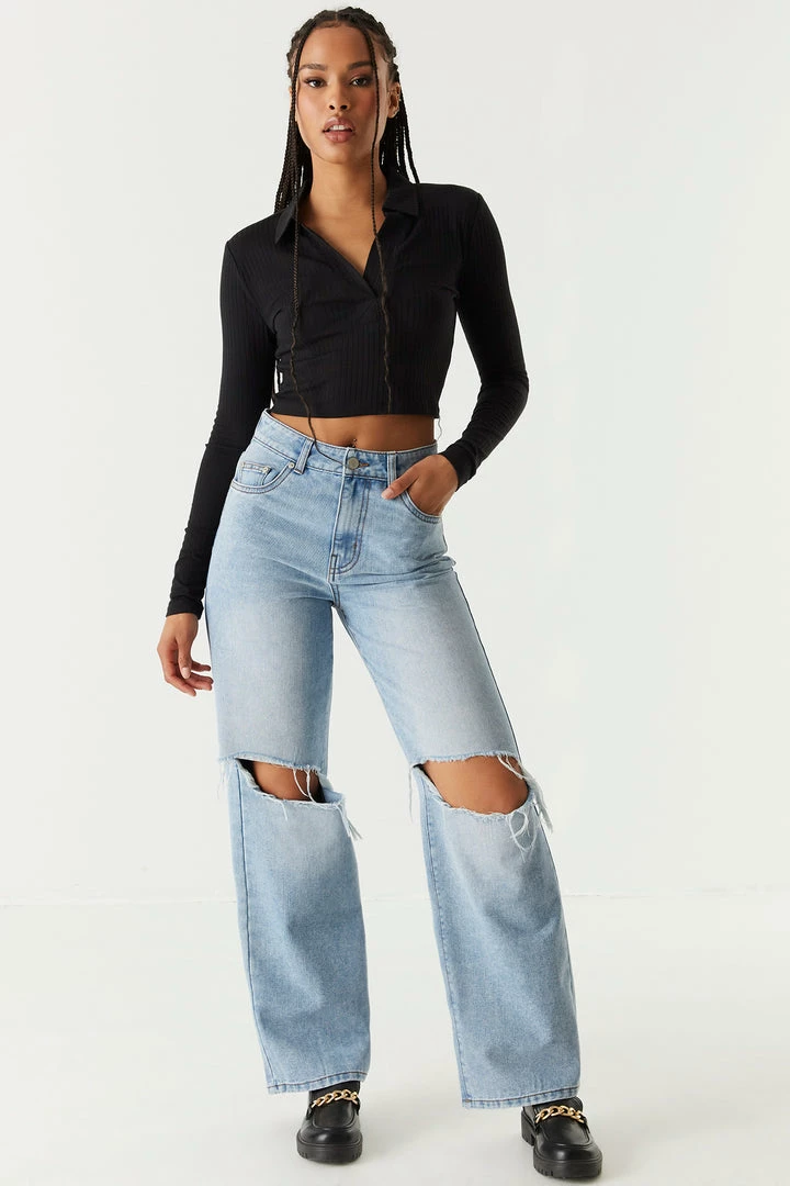 The ultimate it-girl jean needs to meet your wardrobe ASAP! No need to search far and wide, we’ve got you covered on the most-loved silhouette. This jean features a high-rise waist, zip fly closure, belt loops, five pockets, distressed knees and wide legs.