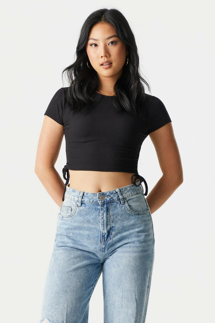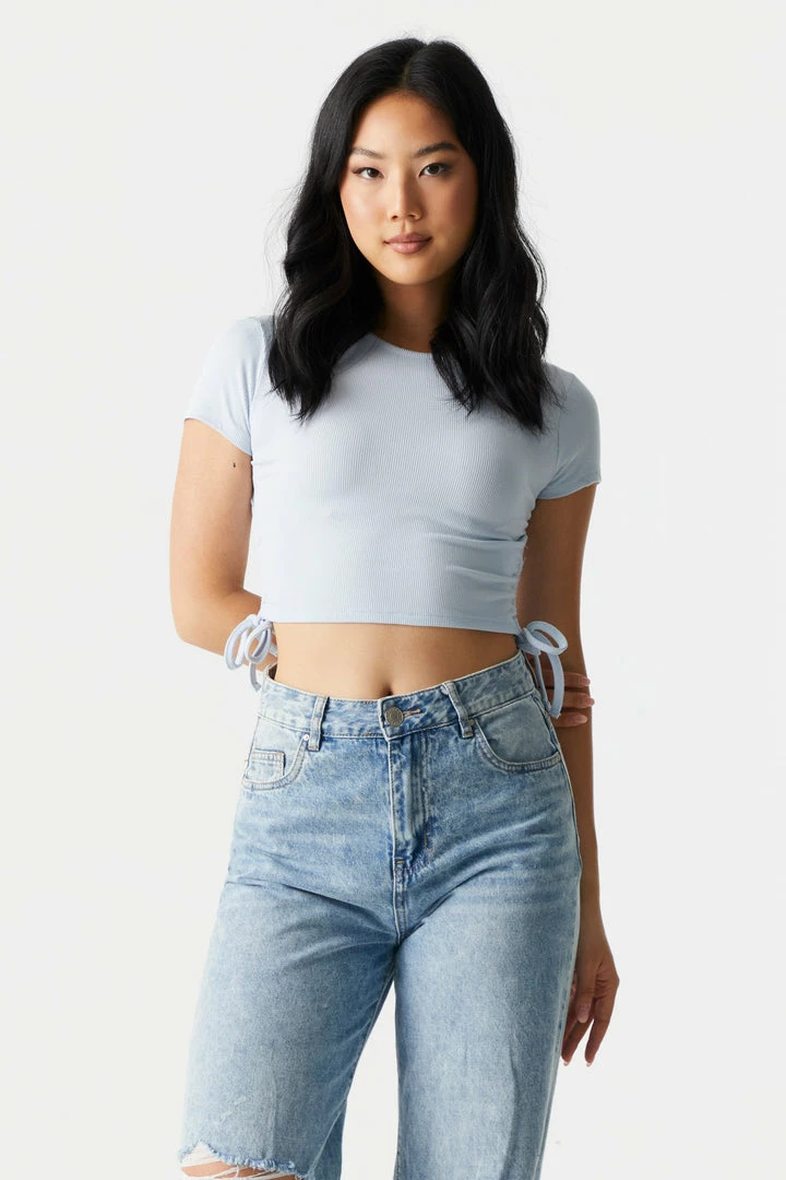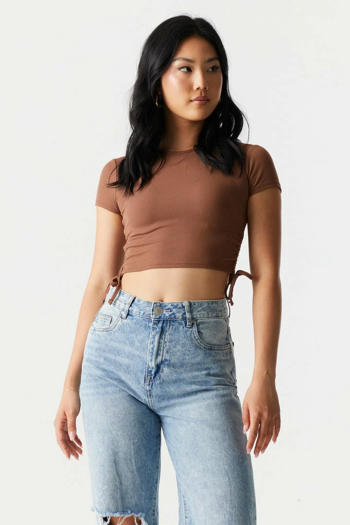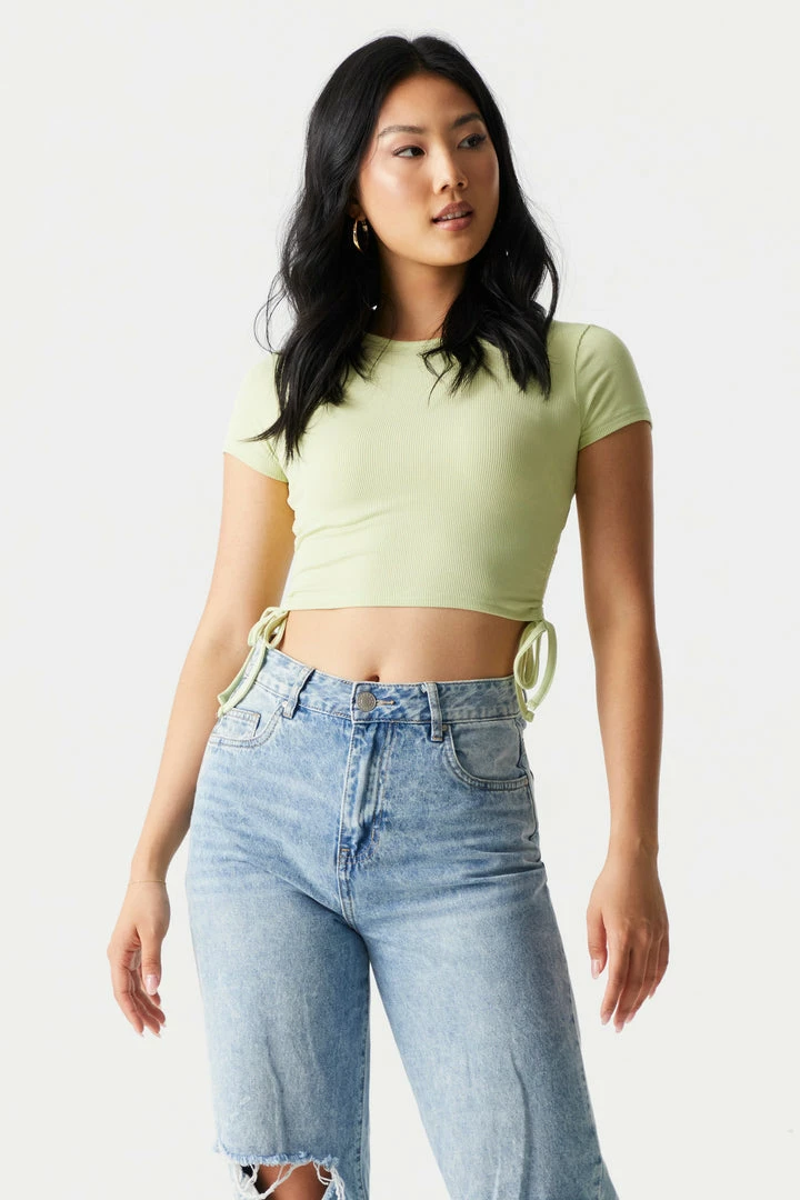 Show some skin in this sultry side-tie tee! This t-shirt features short sleeves, crew neckline, self-tie ruched sides, cropped fit and all over ribbing. Size runs small.