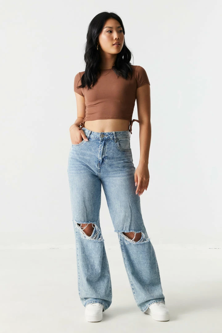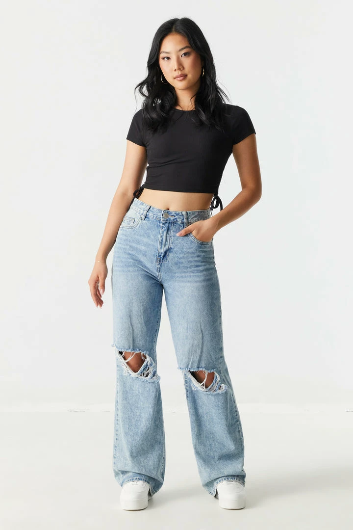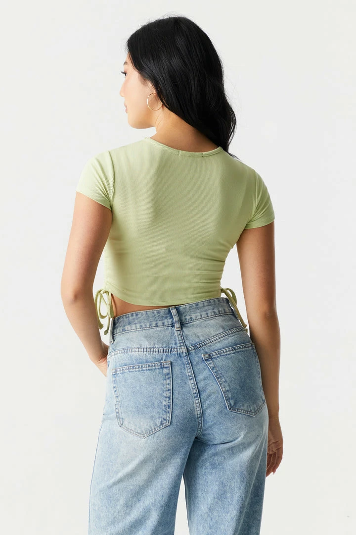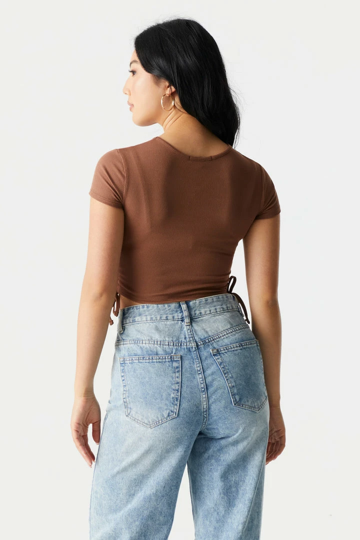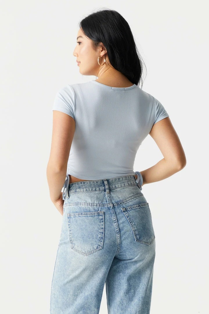 Show some skin in this sultry side-tie tee! This t-shirt features short sleeves, crew neckline, self-tie ruched sides, cropped fit and all over ribbing. Size runs small.
