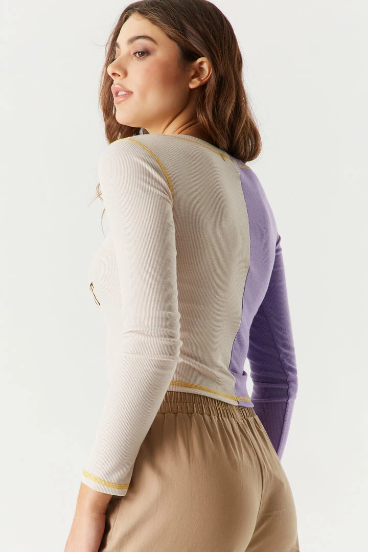 Have a slice of the spliced trend! Get the best of both worlds with two colours in this baby tee. This top features ribbing, spliced design, front graphic, long sleeve and cropped length. Size runs small.