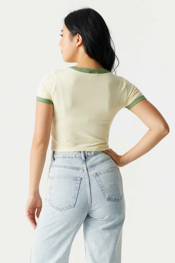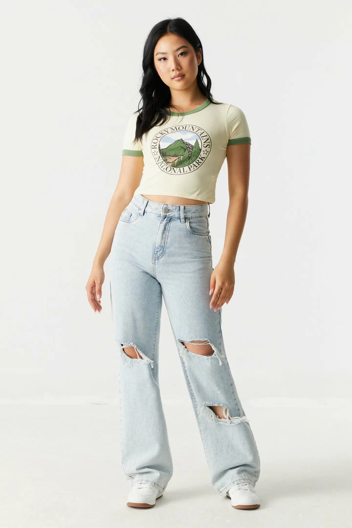 Explore the big world in a tiny top! From the highway to the hike this roadtrip tee will make you the only sight worth seeing. This t-shirt features short sleeves, cropped fit, contrast trim, crew neckline and Rocky Mountains front graphic. Size runs small.