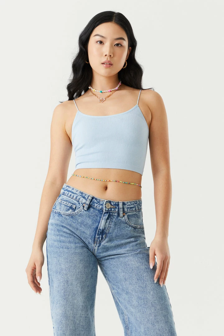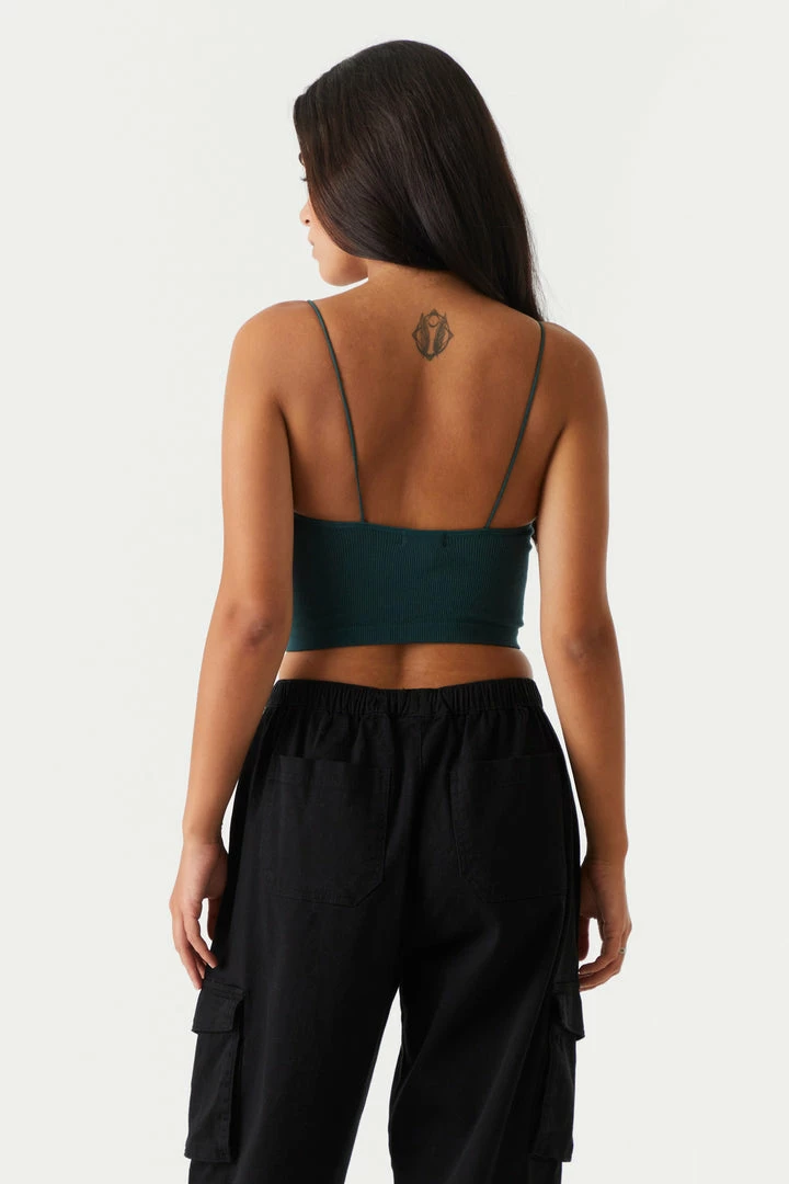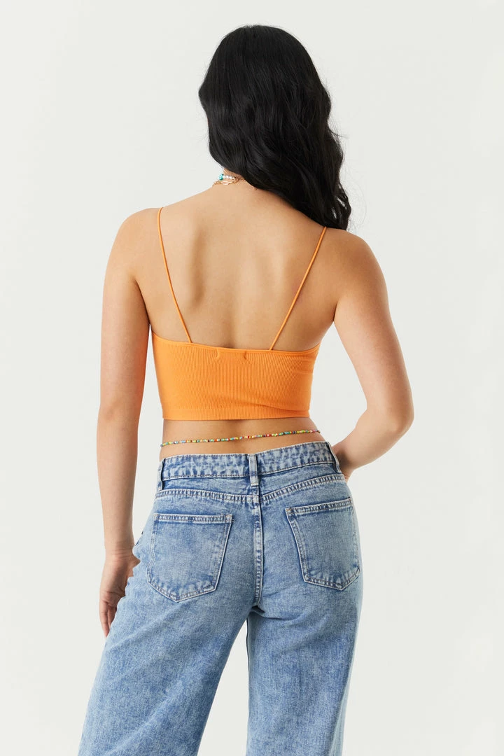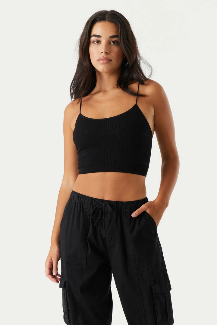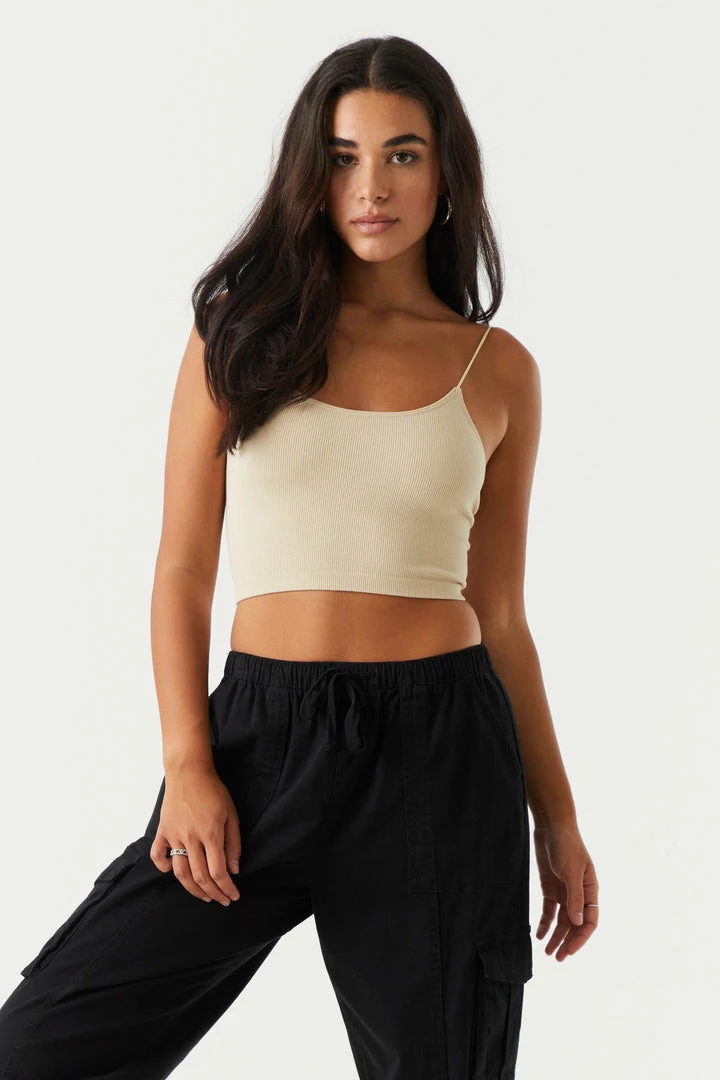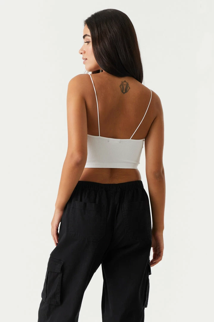 This dreamy base layer will fit seamlessly into your tiny top rotation. This cami features bungee straps, scoop neckline and cropped fit. Size runs small.
