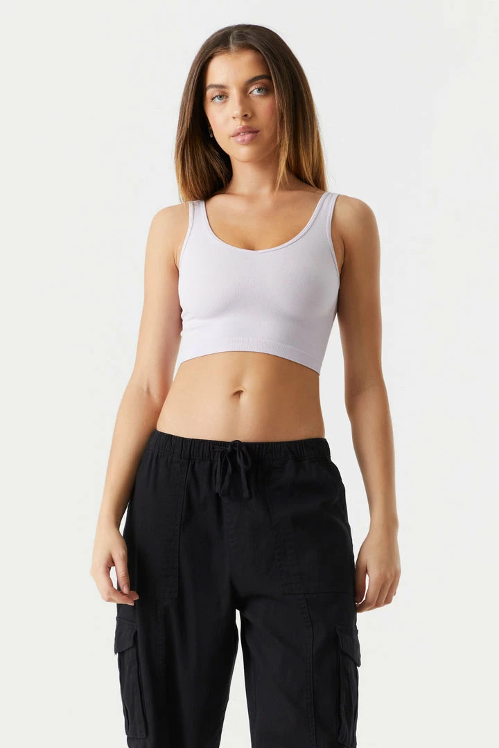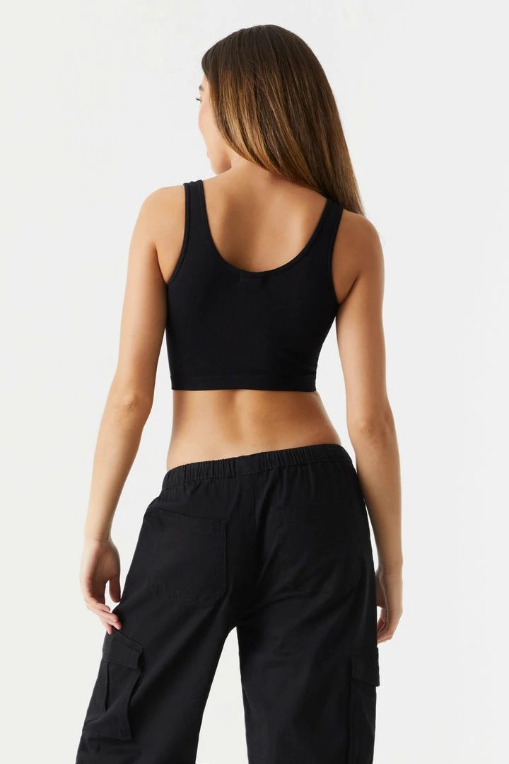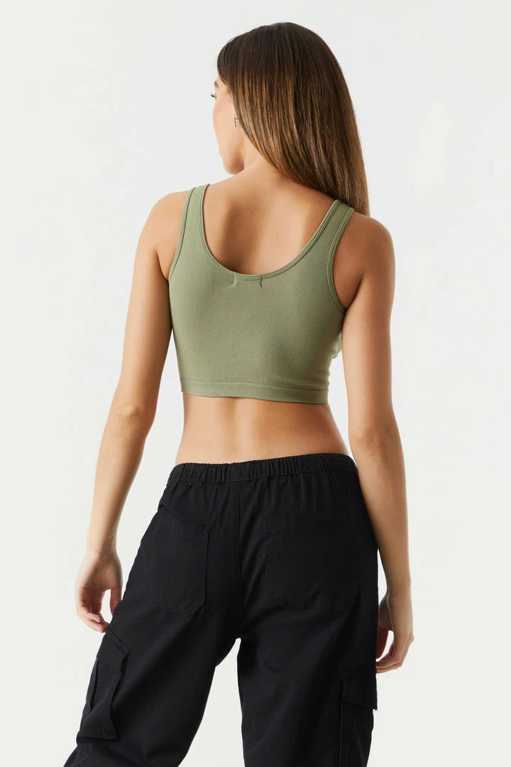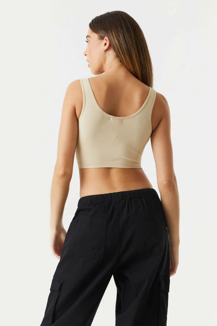 Is your wardrobe ready for a seamless restock? This staple item is the perfect base layer to any outfit. This top features seamless design, scoop neckline, tank sleeves, cropped fit and all over ribbing. Size runs small.
