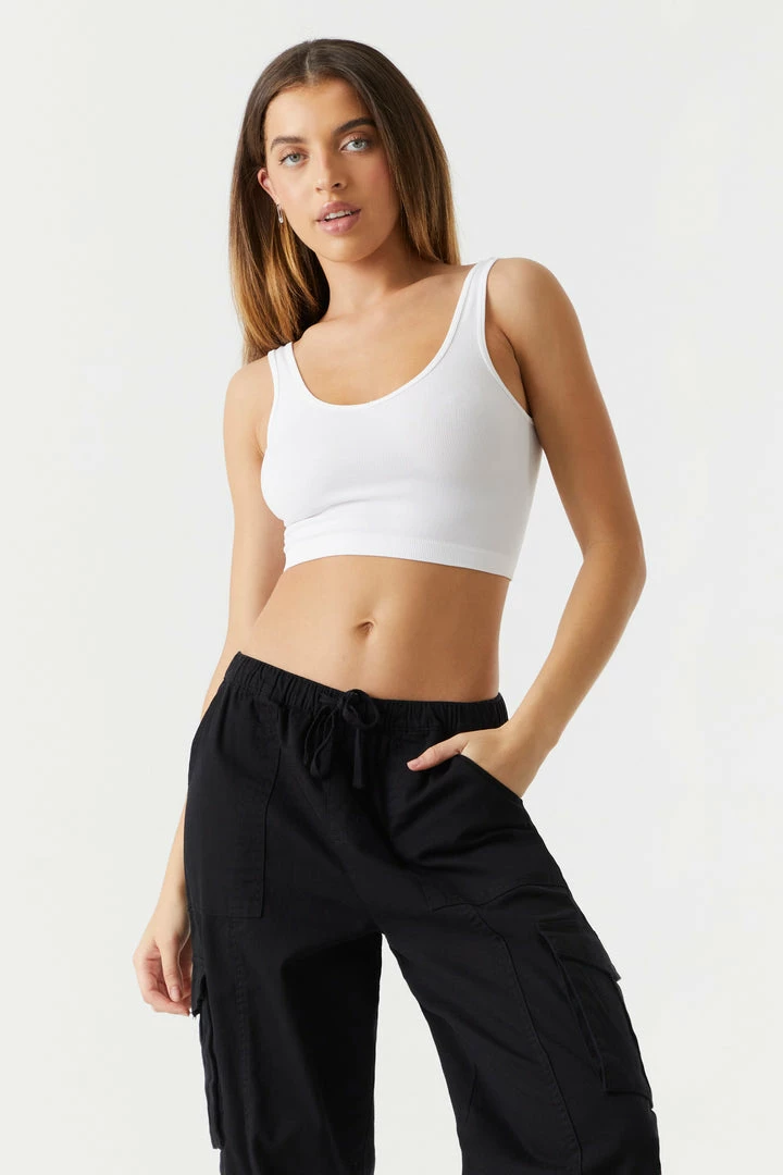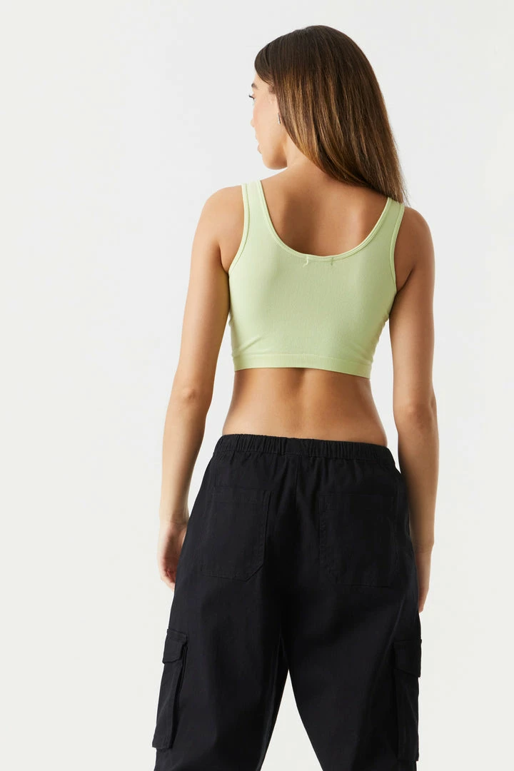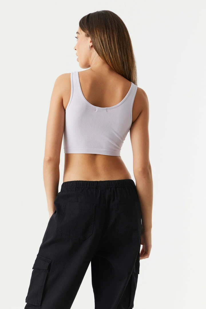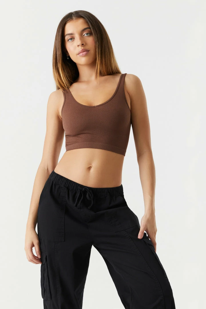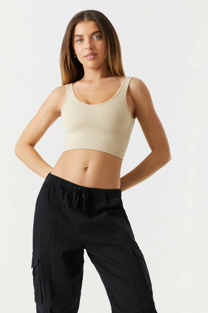 Is your wardrobe ready for a seamless restock? This staple item is the perfect base layer to any outfit. This top features seamless design, scoop neckline, tank sleeves, cropped fit and all over ribbing. Size runs small.