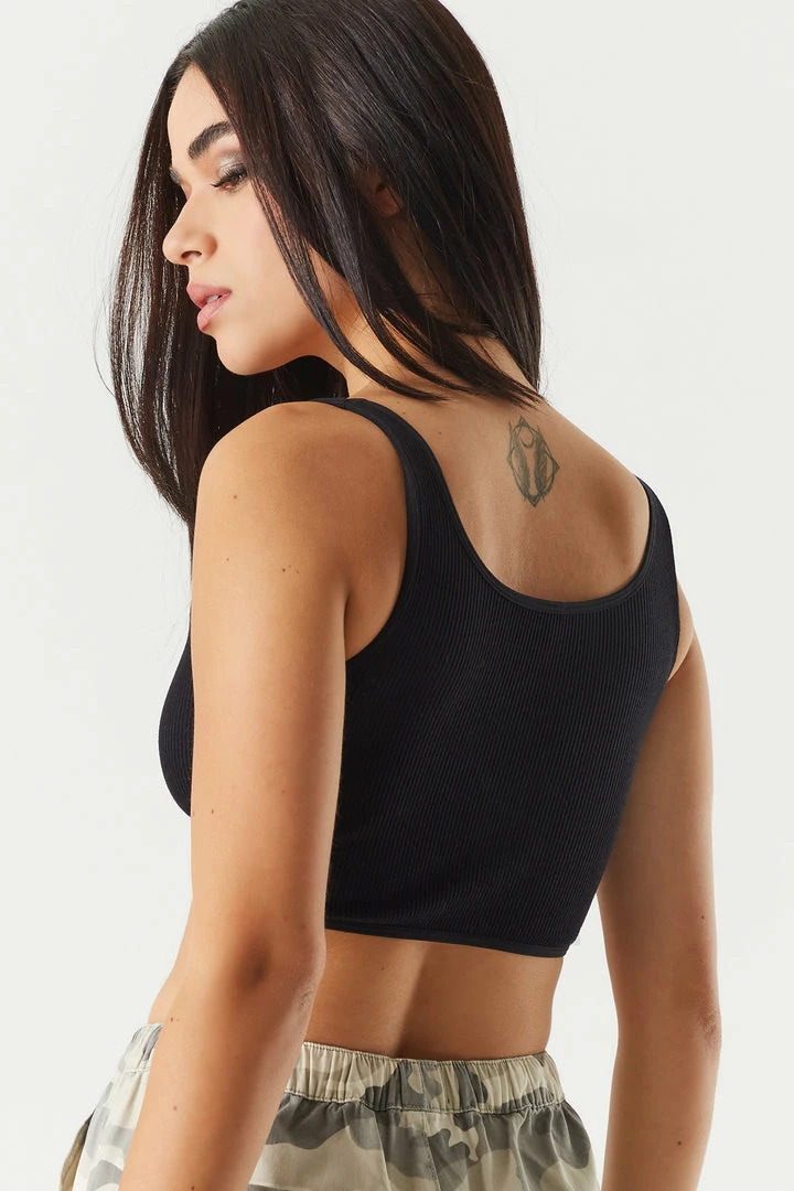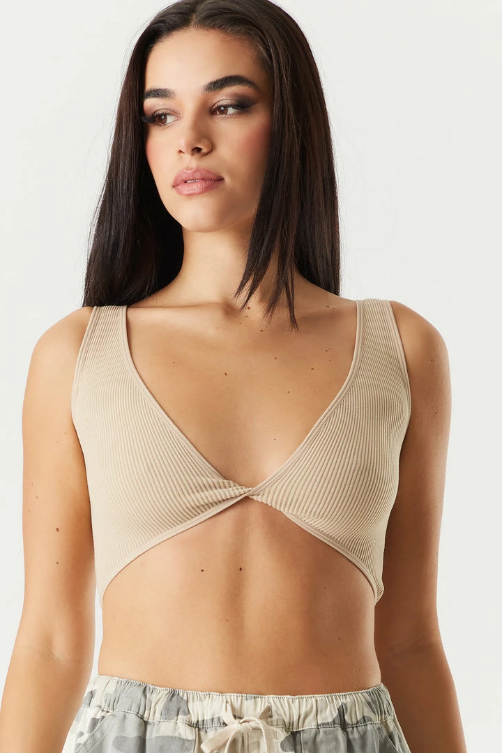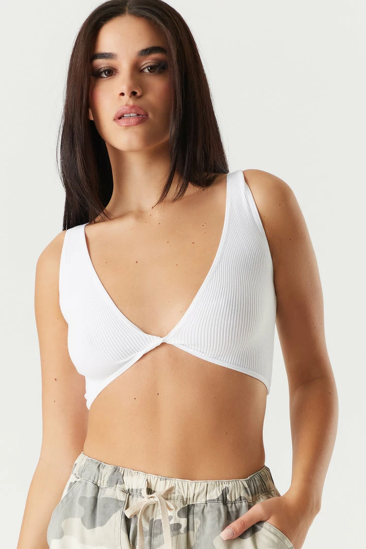 Sleek. Sexy. Curve-hugging perfection. A seamless solution to those “what-should-I-wear” moments. This top features a plunging v-neckline with a front knot twist detail, ribbing, sleeveless arms, cropped length and seamless construction.