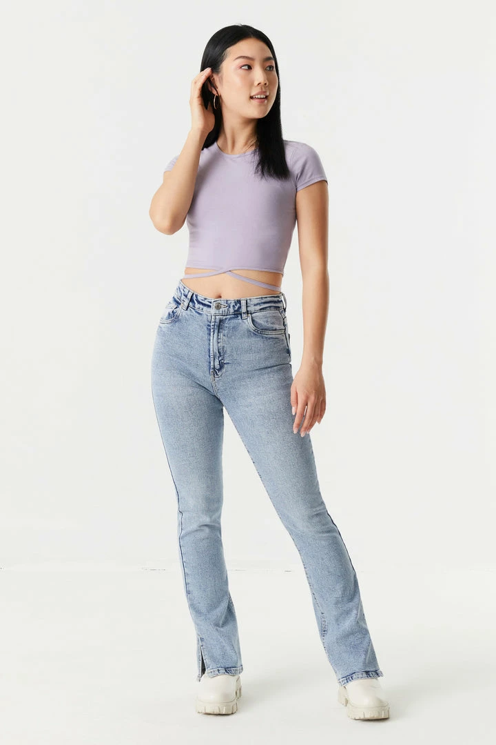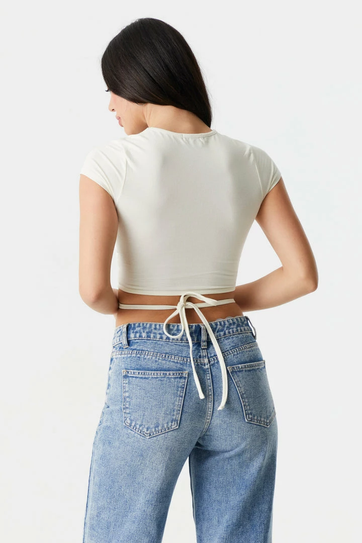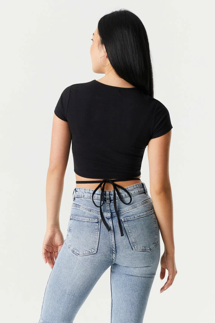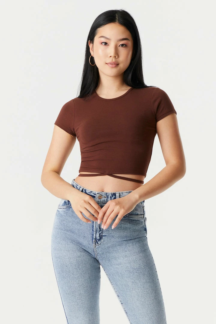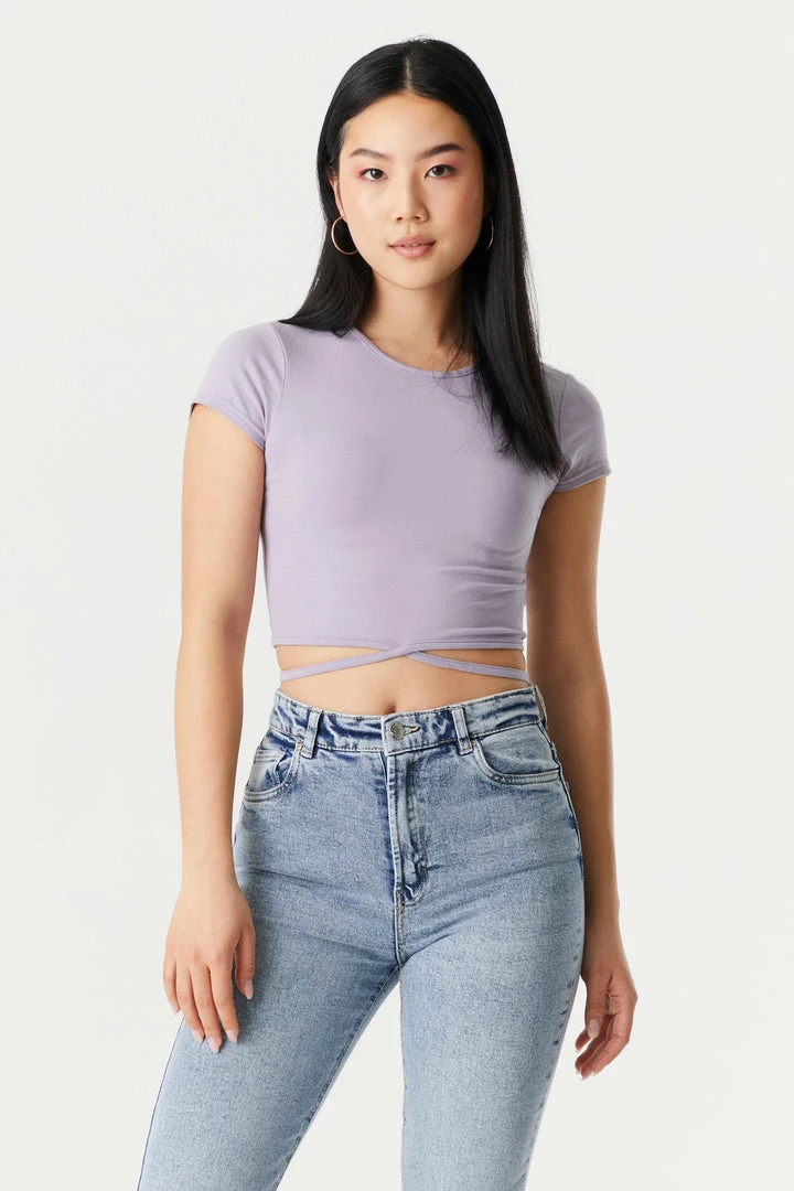 Send your basic tees on vaycay and start your summer on a stylish note! This t-shirt features short sleeves, cropped fit, criss cross self-tie waist and crew neck. Size runs small.