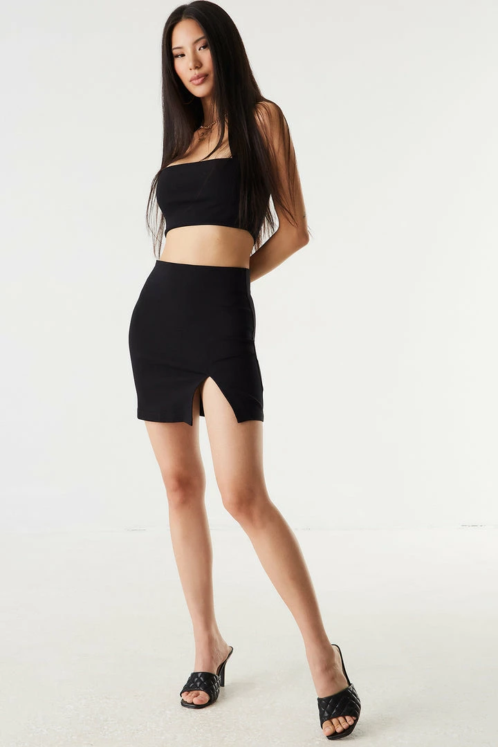 Solve all those ‘nothing to wear’ dilemmas with this set for fool proof night out dressing! This skirt features a high-rise waist, mini length and front side slit. Set me up with Square Neck Halter Cropped Top. Size Runs Small.
