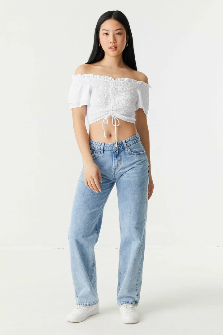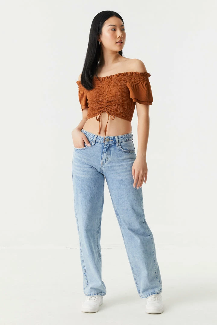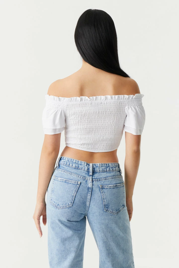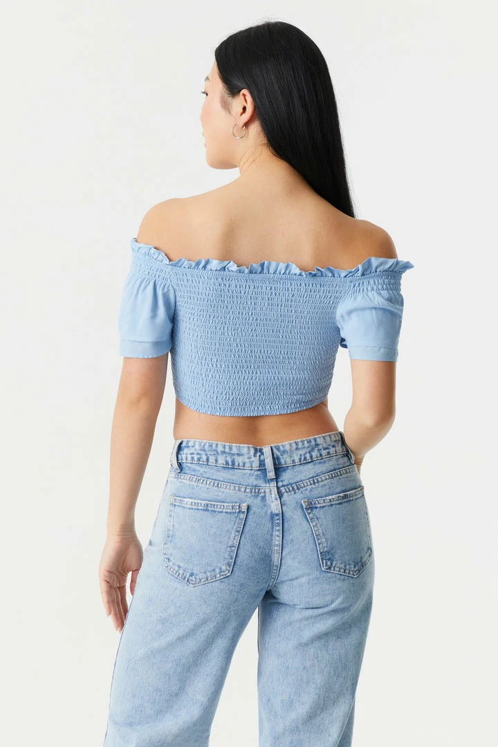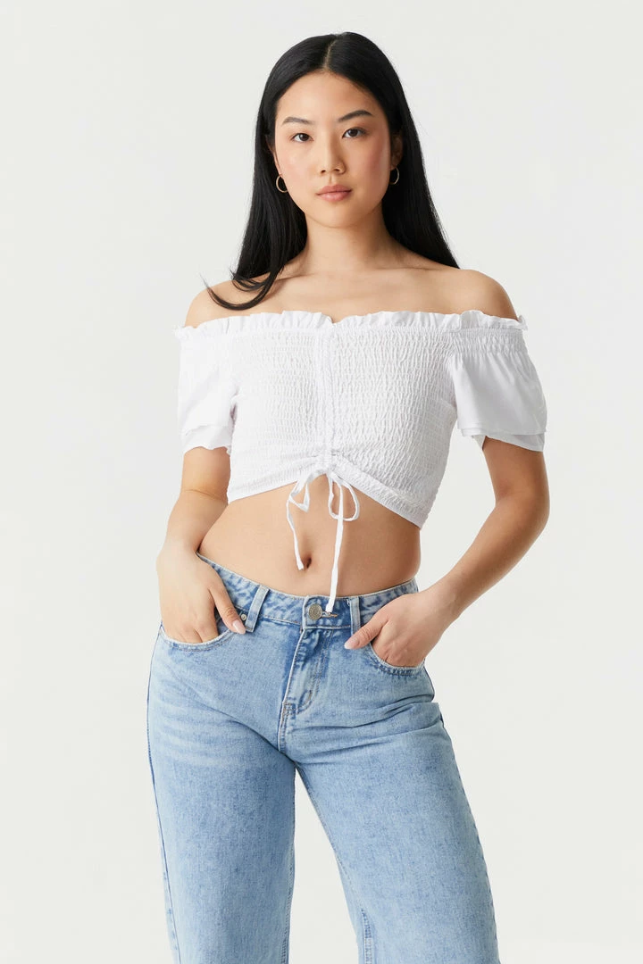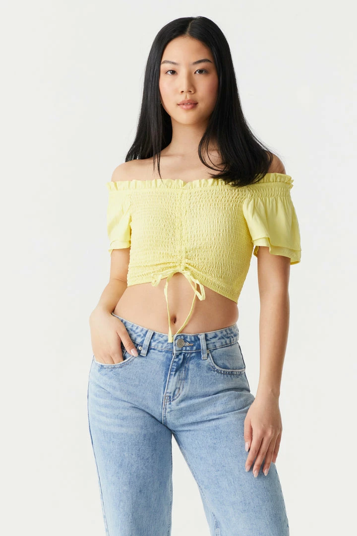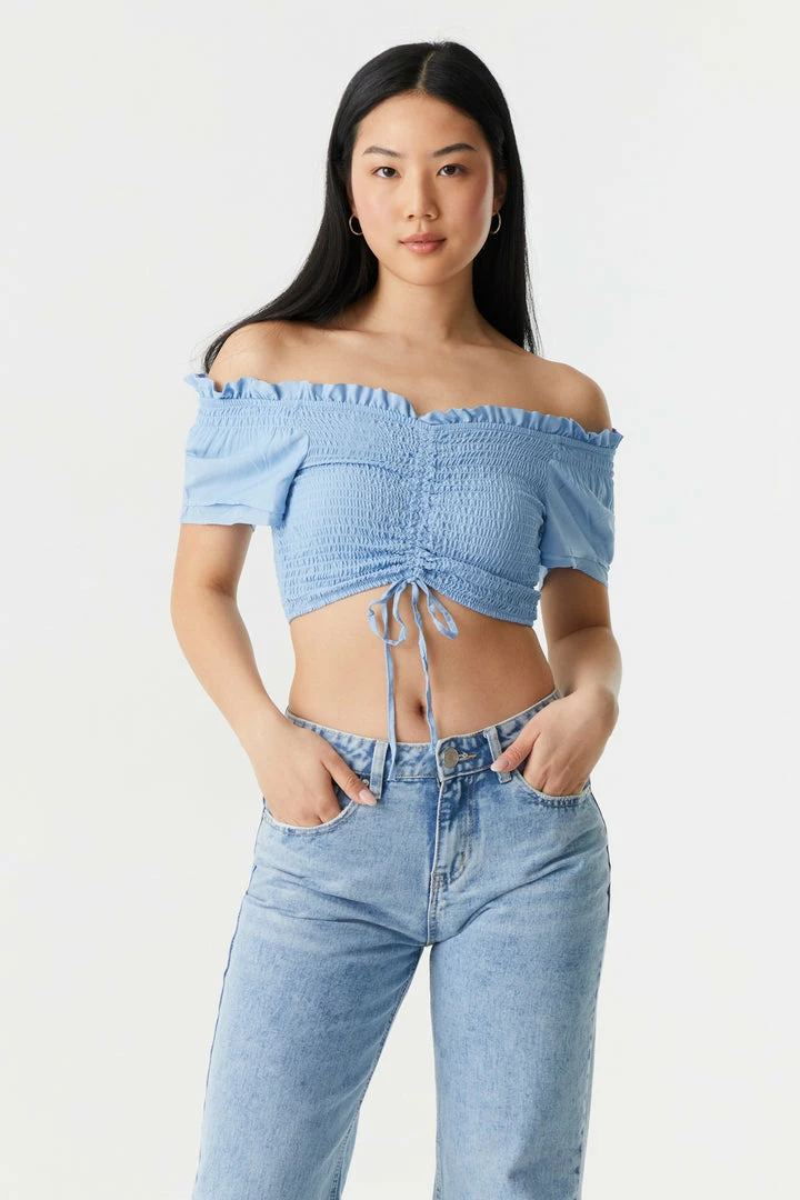 Embrace the frills of femininity with this show-off top! This top features smocked bodice, ruched self-tie front, off the shoulder style, short sleeves and cropped fit. Size Runs Small.