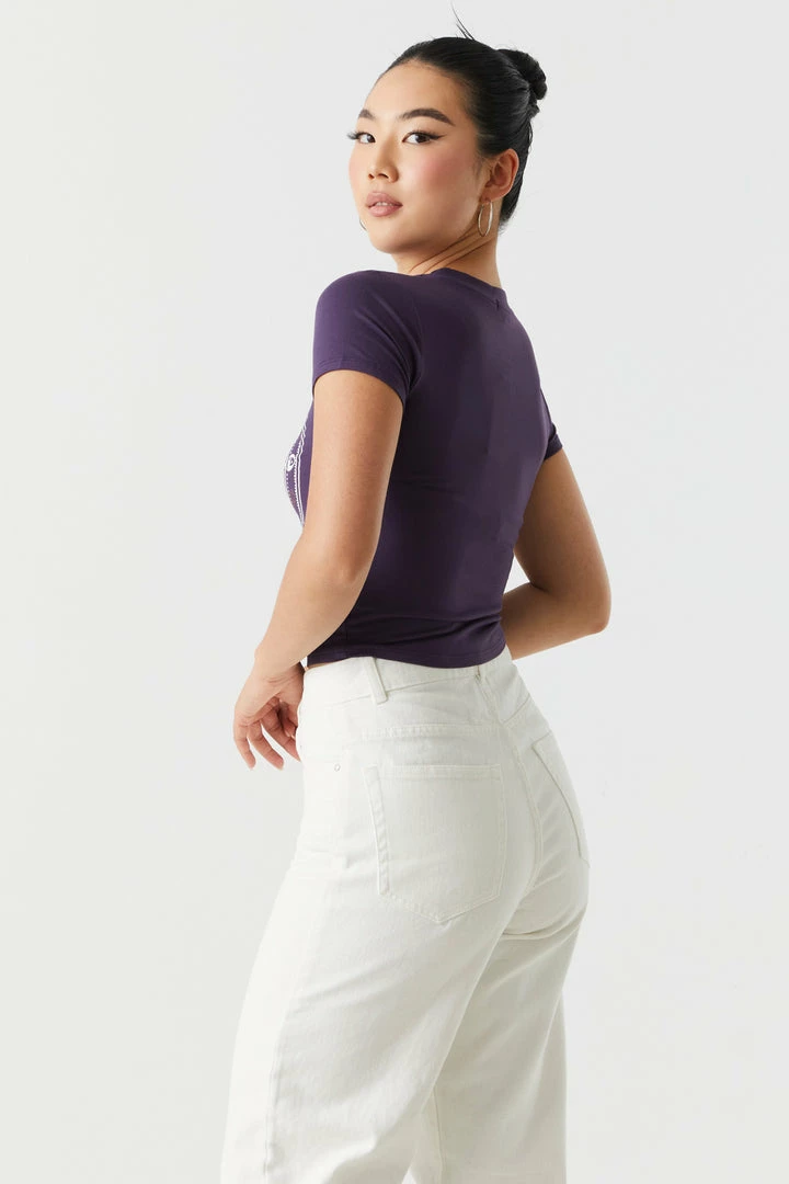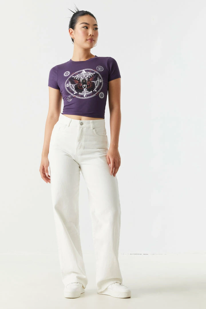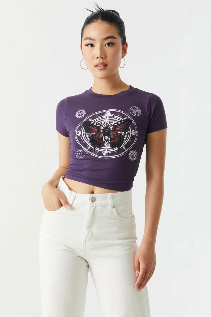 There’s magic in the air! Or is it in the tees? This t-shirt features crew neckline, short sleeves, butterfly graphic, cropped fit and soft material. Size Runs Small.