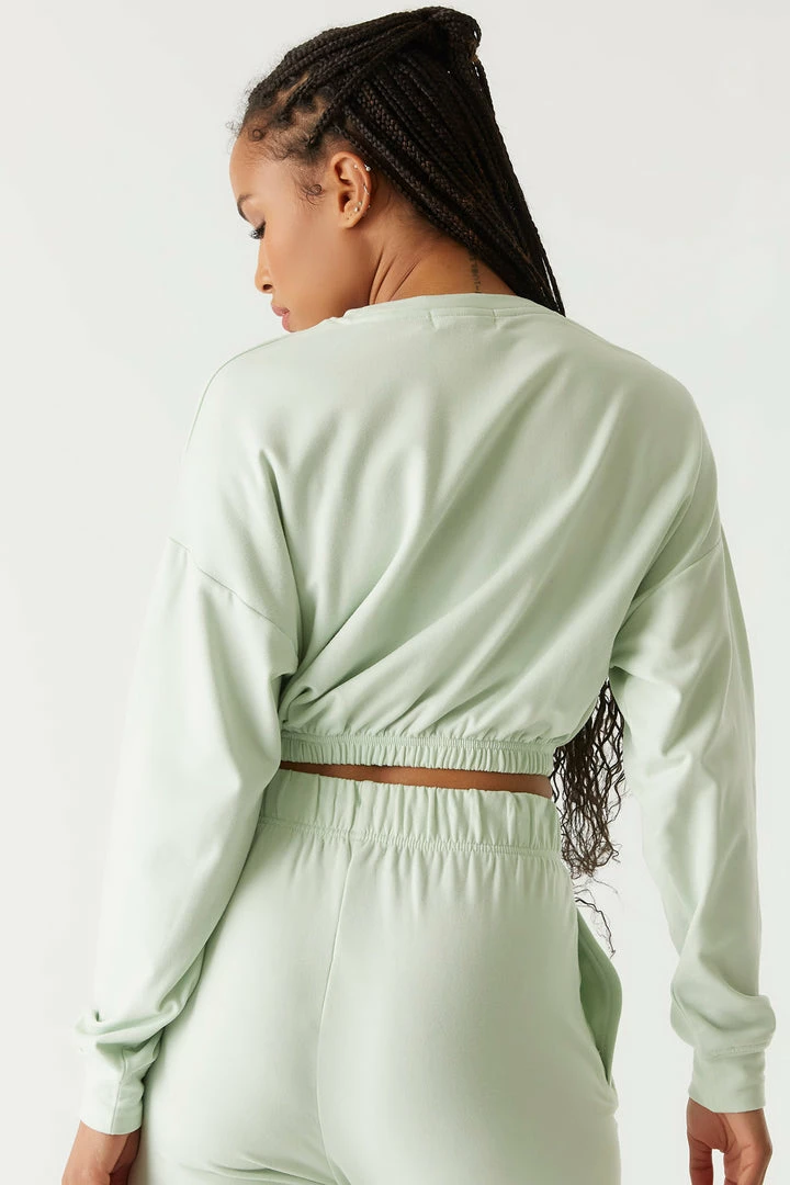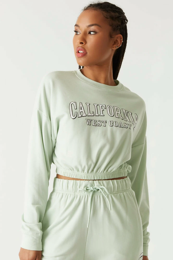 You deserve to chill in the softest lounge set! This top features a crew neckline, front graphic, elasticized cinched hem, soft fleece material, long sleeves and a cropped length. Size Runs Small. Complete the ‘fit with Soft Fleece California Graphic Jogger