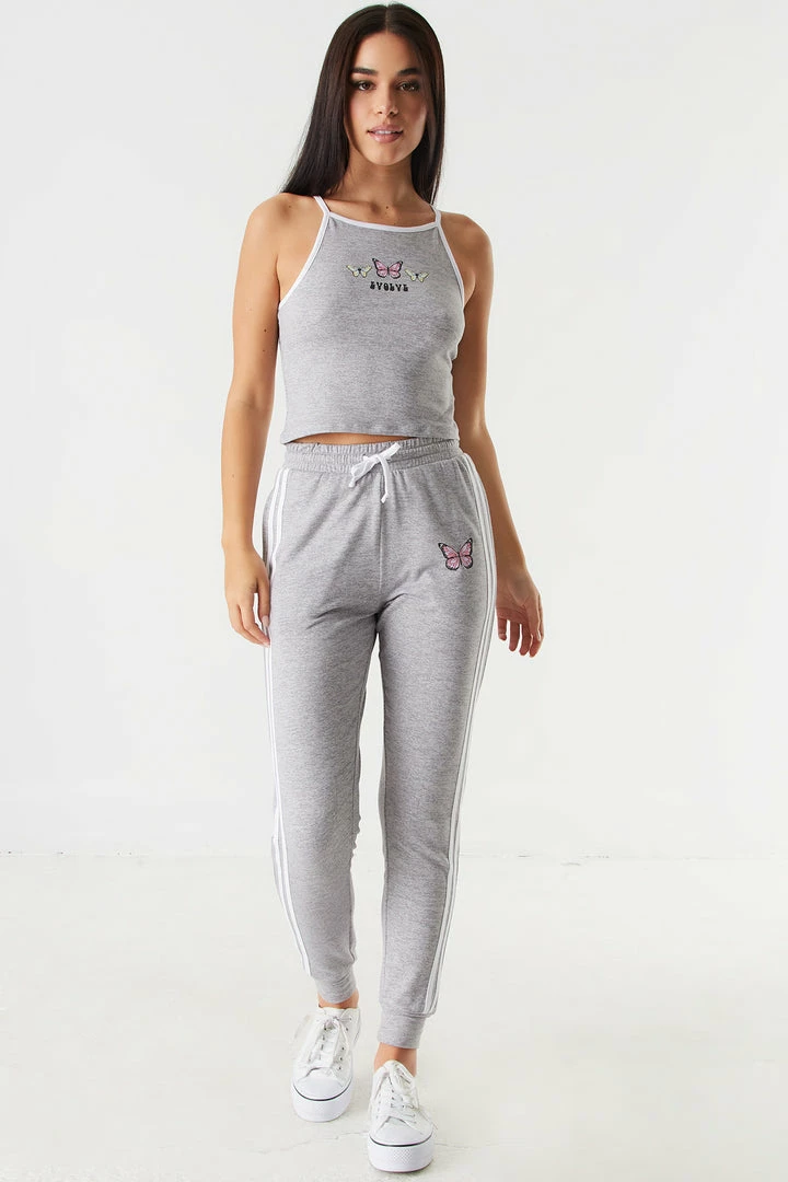 Say tank you, next to all of your other tops! This tank features a high neckline, front graphic, soft material, spaghetti straps and cropped length. Size Runs Small. Set me up with Soft Fleece Graphic Side Striped Jogger