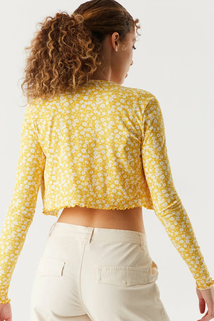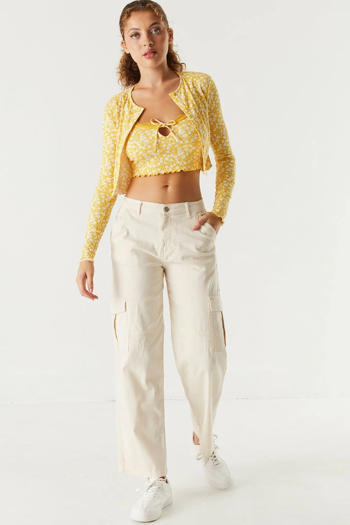 Twinning is winning! Get your look sorted with a matching cami and cardi set. This twin set features a soft cropped ribbed cami with adjustable straps, lace and lettuce trim and a front self-tie detail at the bust and a soft cropped button-up cardigan with lettuce trimming. Size runs small.