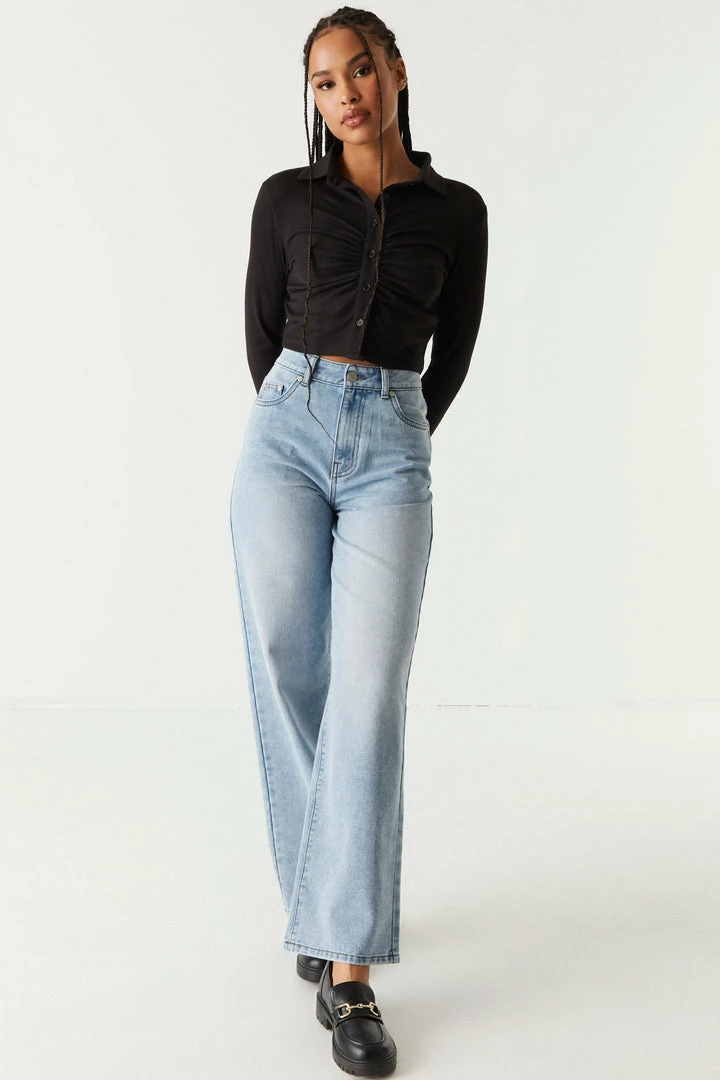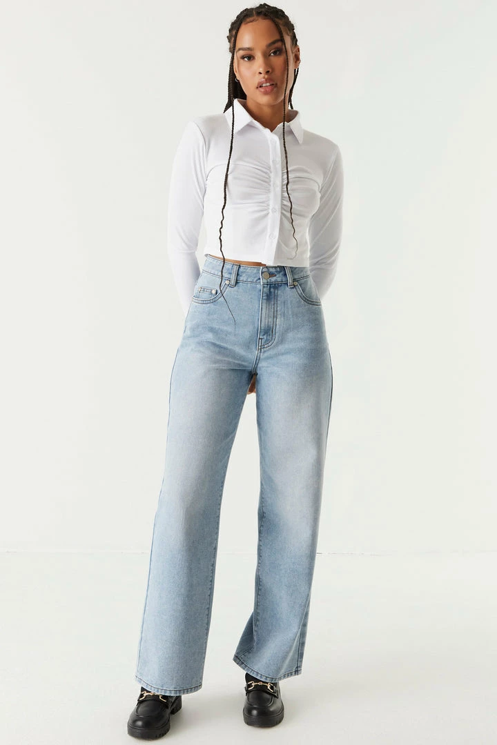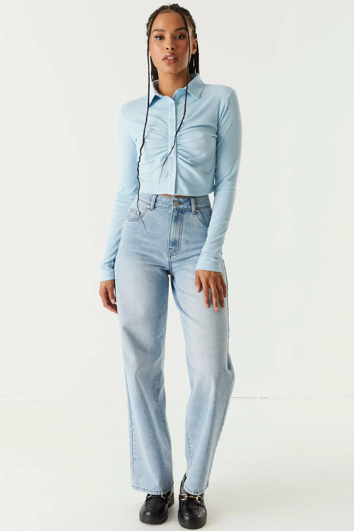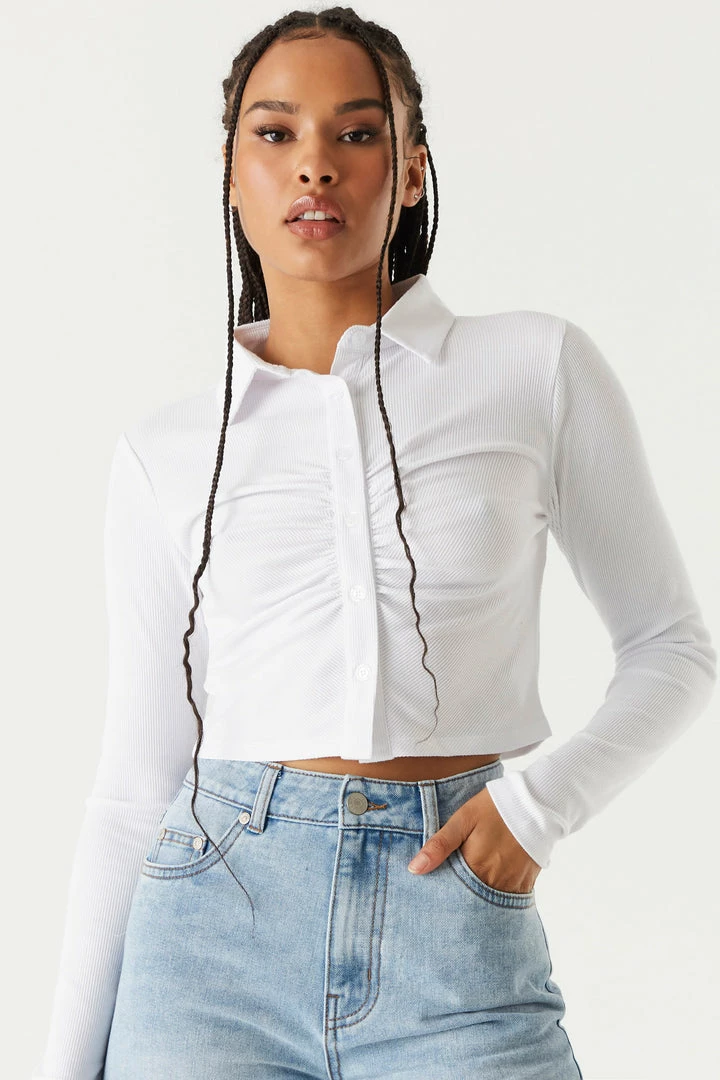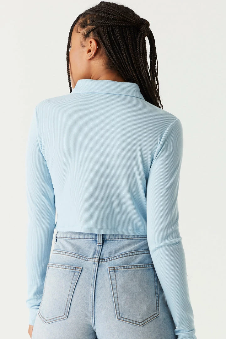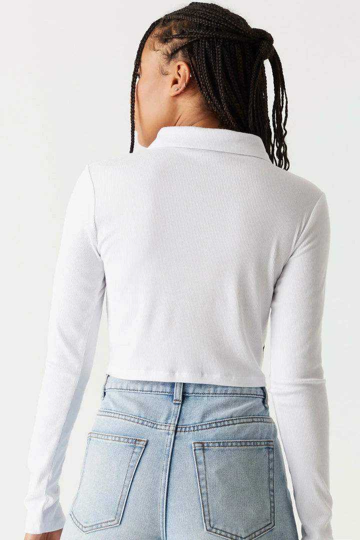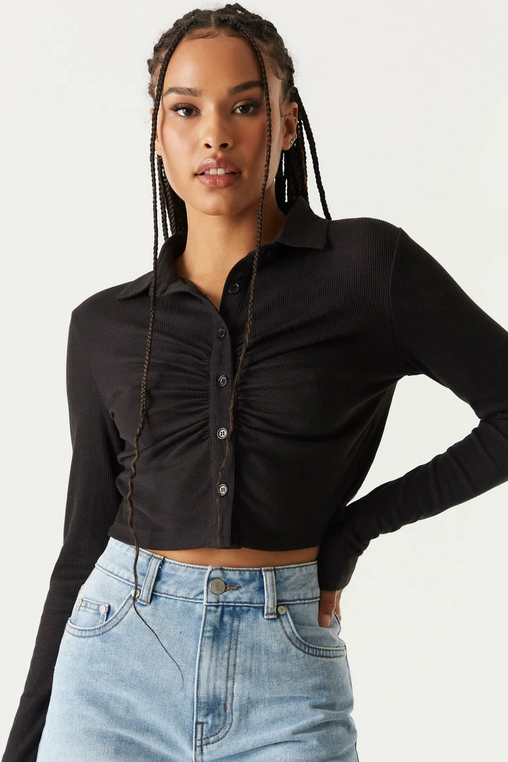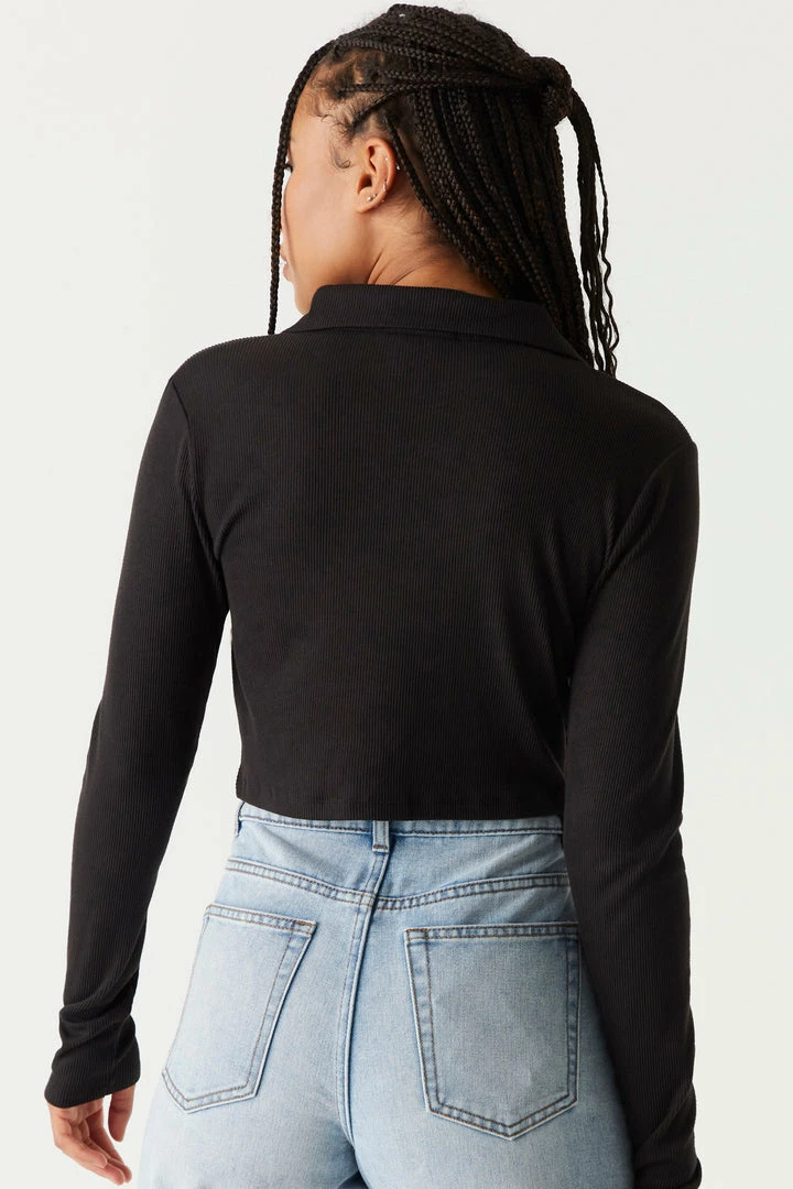 Rely on an on-trend polo top to get your through what-do-I-wear-today days. This top features a front button-up closure with ruching, collar, ribbing, long sleeves, soft material and cropped length.