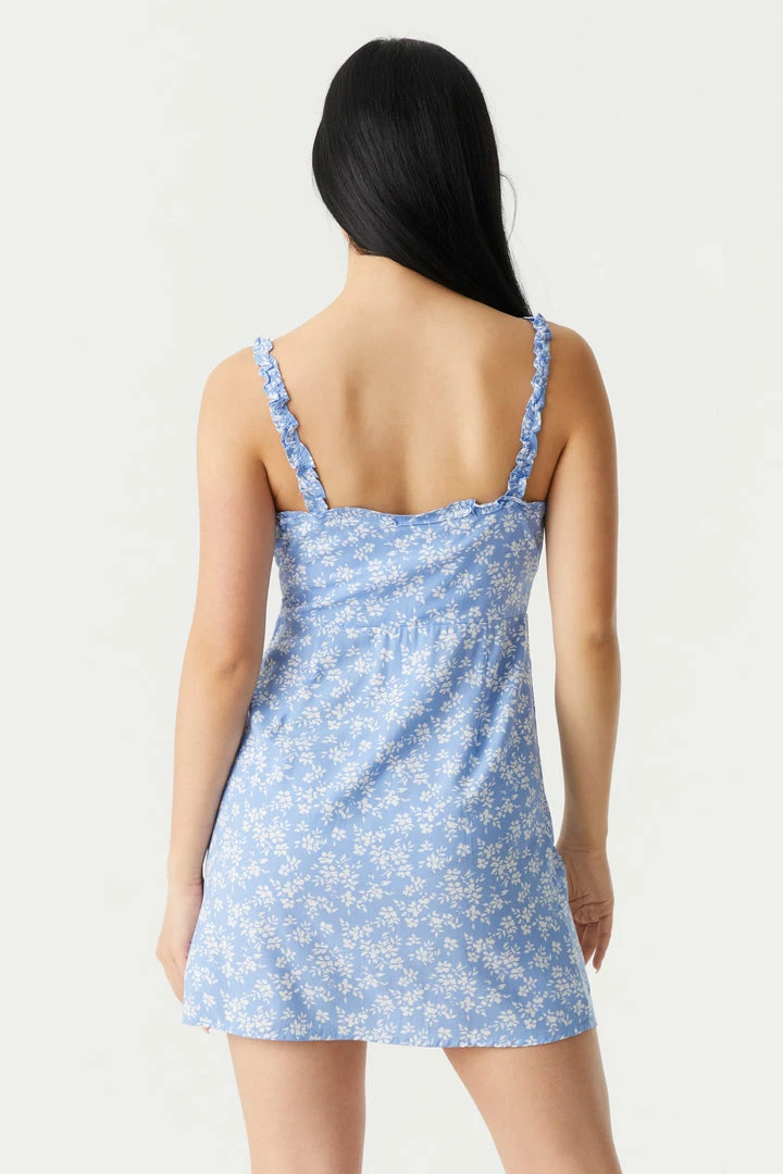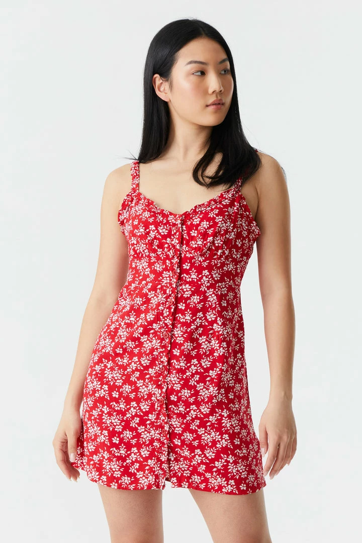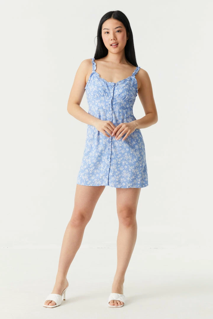 Feel as fresh as a daisy! And look as cute as one too in this flirty sundress. This dress features button-up front, ruched bust, ruffled trim and straps, all over print and sweetheart neckline. Size Runs Small.