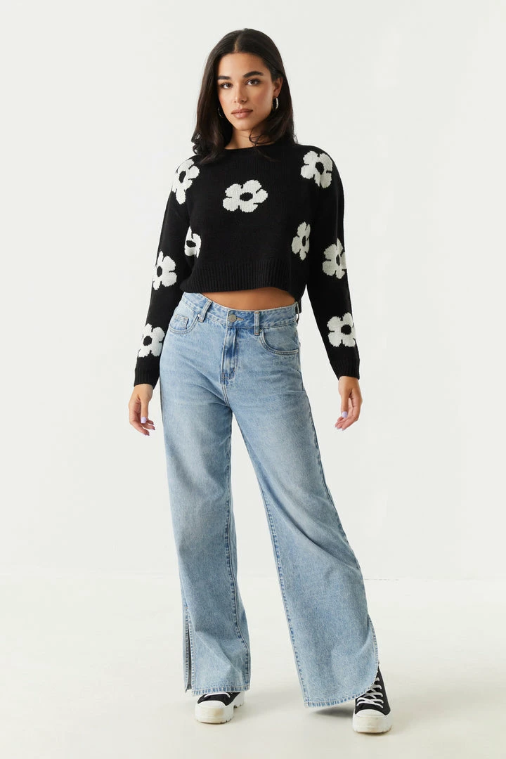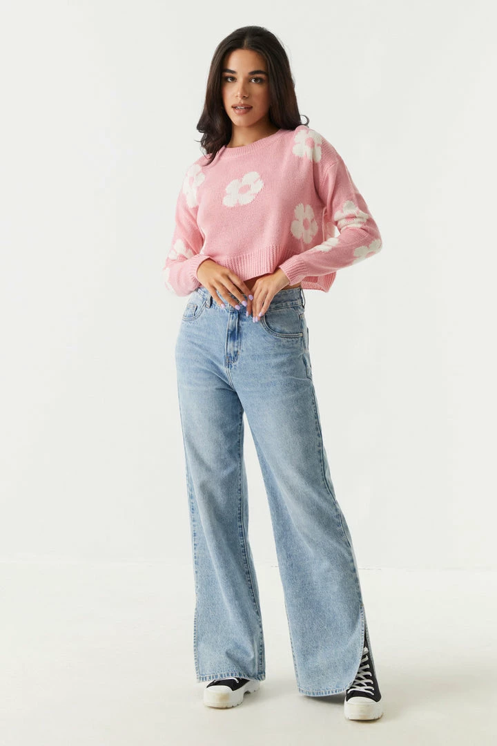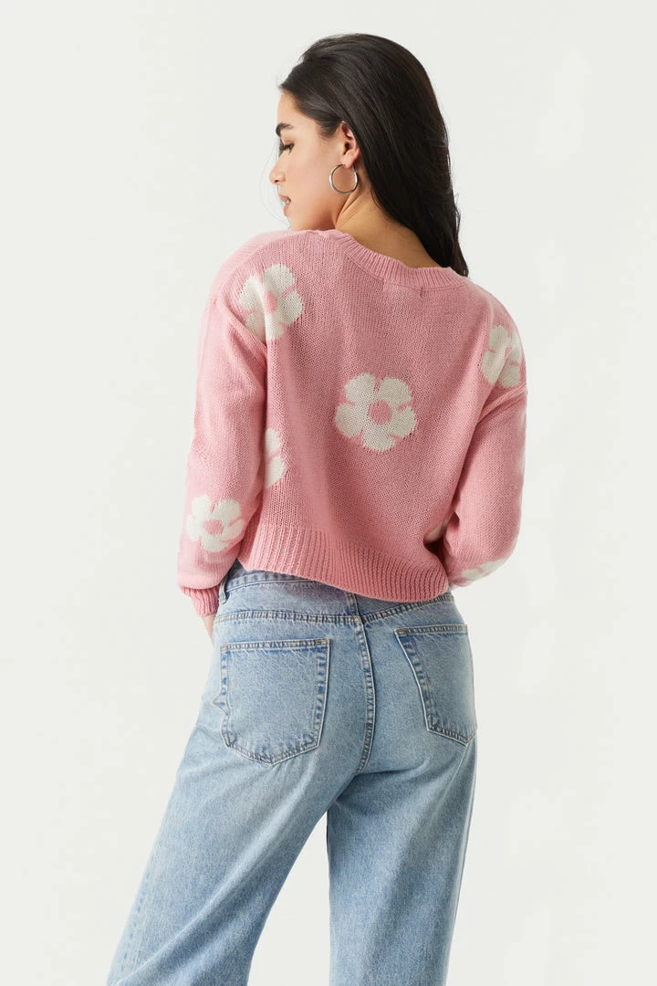 Stop and smell the flowers! Take a moment to enjoy the little things in life… life cropped knits! This sweater features long sleeves, crew neckline, cropped fit and all over daisy print. Size Runs Small.