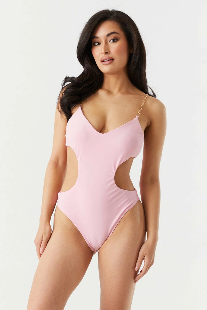 Strut your stuff in this sultry one piece and cut boring swimwear out of your beach babe style! This one piece swimsuit features chain straps, cut-out sides and v neckline.