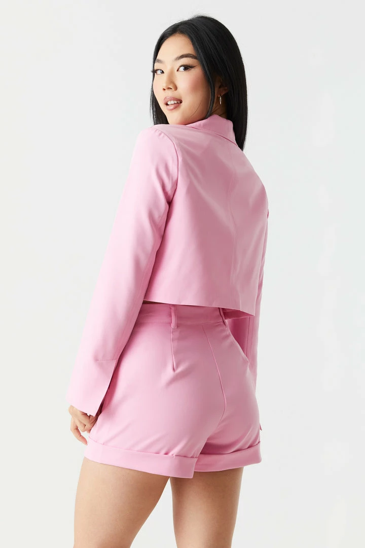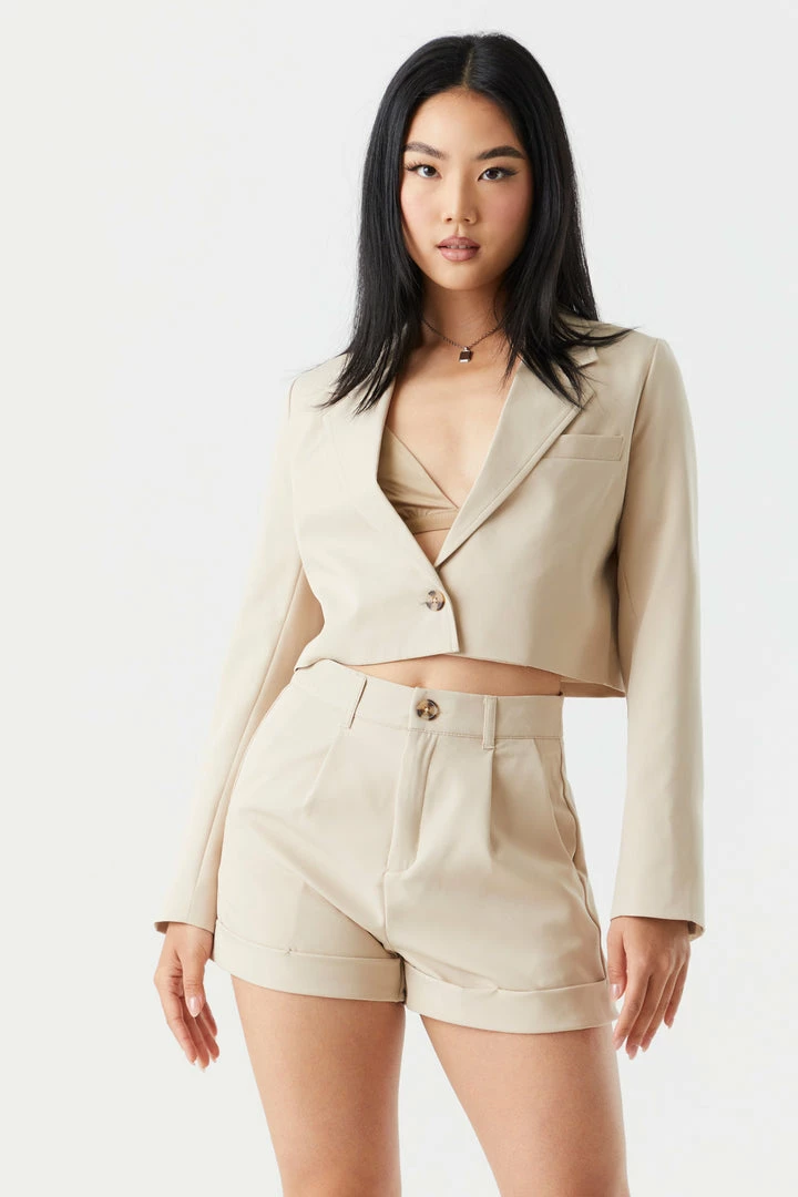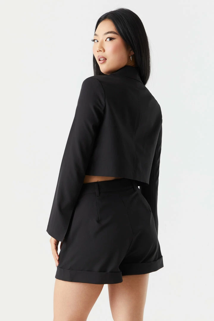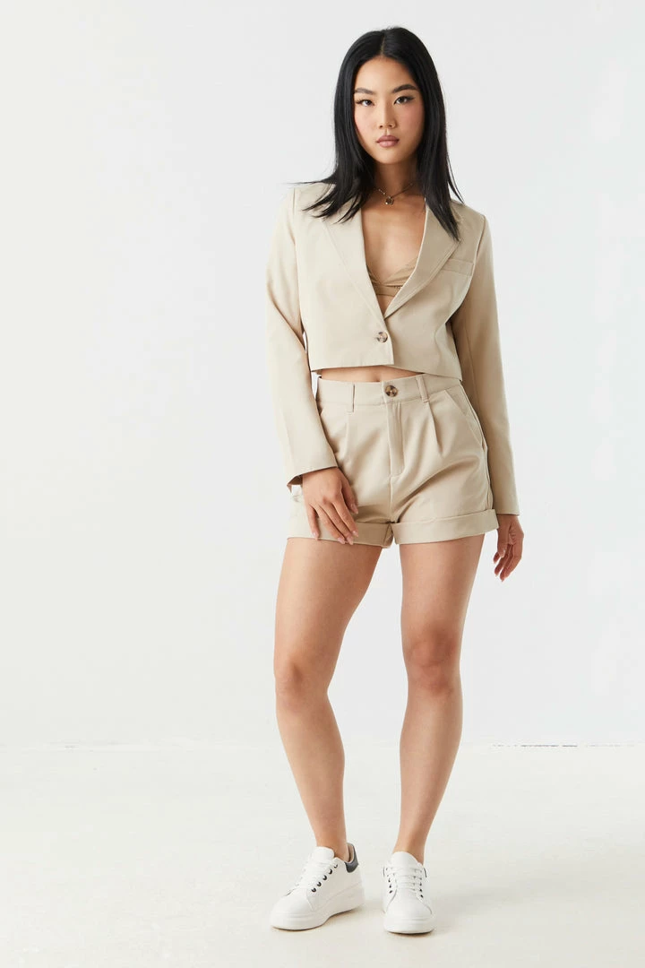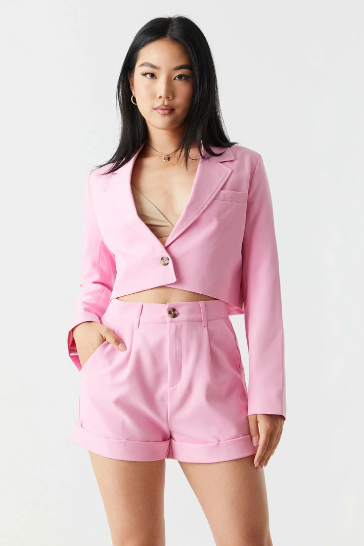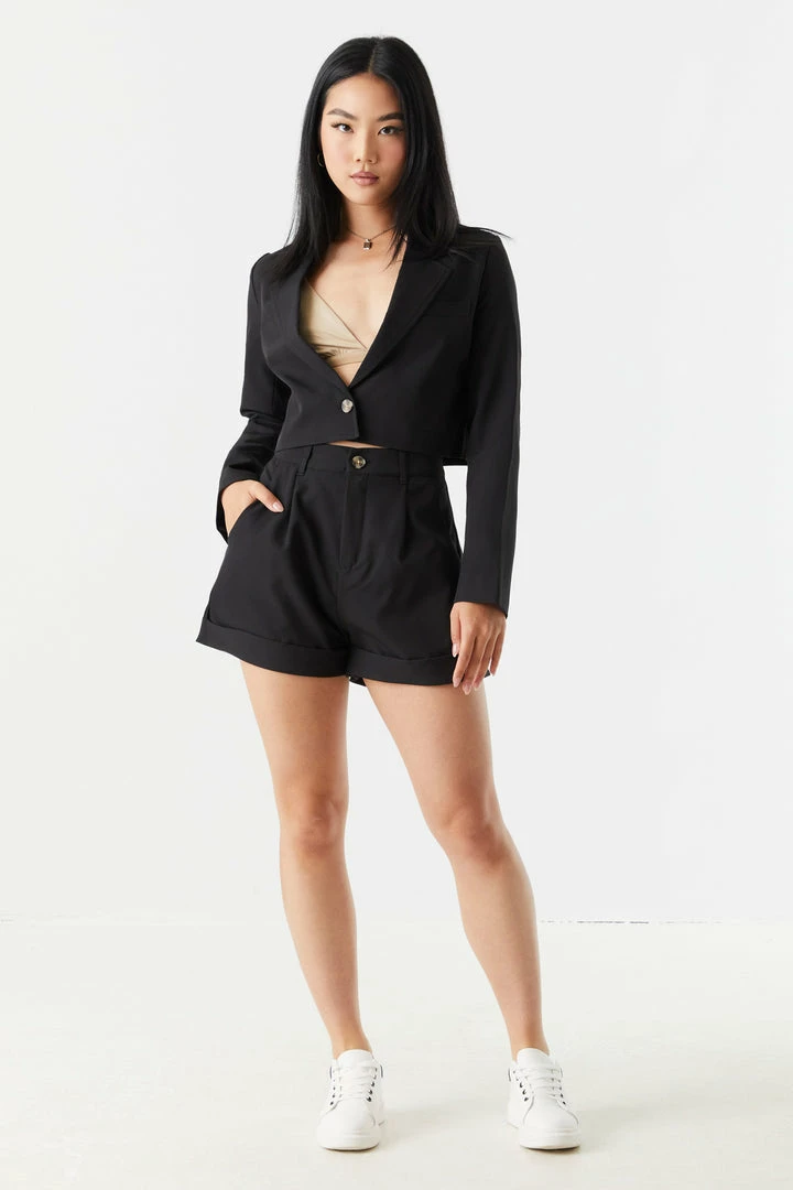 Channel your professional side but add a flirty flare with this cropped blazer. This blazer features single button closure, long sleeves and cropped fit. Complete the look with the Tailored Rolled Hem Single Button Short.