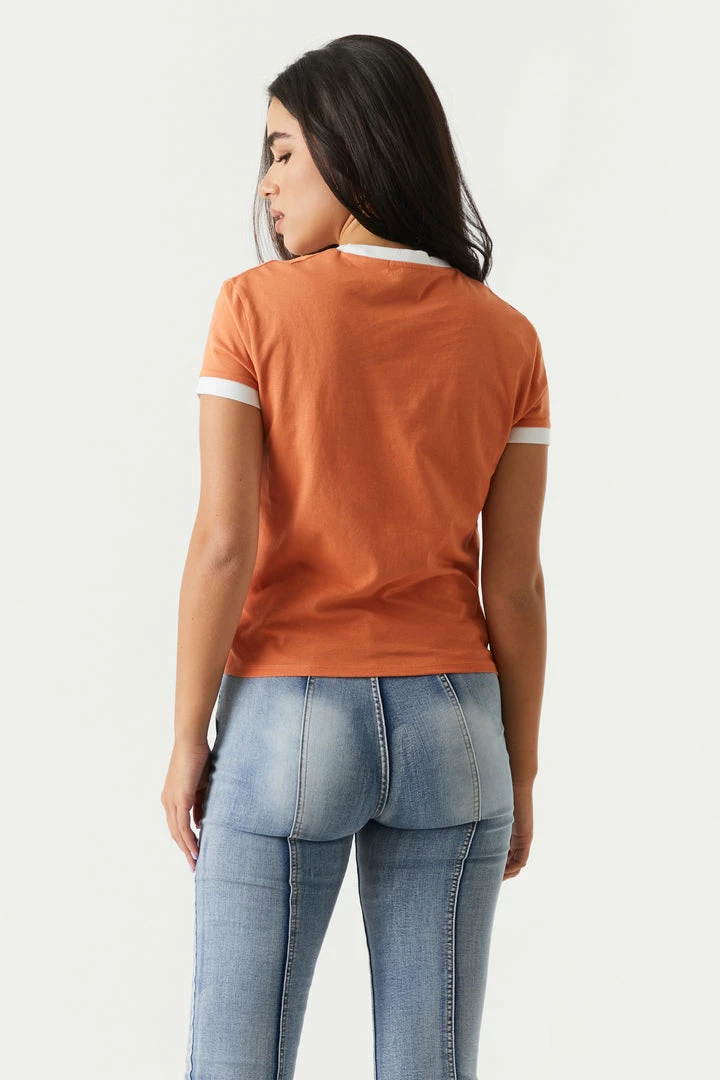 We are getting some serious 70’s summer camp vibes from this vintage inspired tee. Travel back to a more stylish time with this fun fit. This t-shirt features contrast trim, ringer style, short sleeves, crew neckline and front graphic. Size runs small.