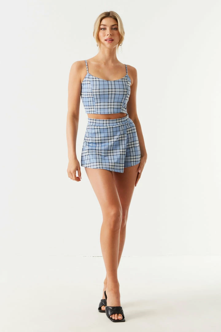 Embrace your inner Clueless Queen and turn the world into your runway with this plaid pairing. Set yourself up for success with This top features adjustable straps, zip-up side closure, all over plaid print, square neckline and cropped fit. Size Runs Small. Pair with the Blue Plaid High-Rise Skort to complete the look.