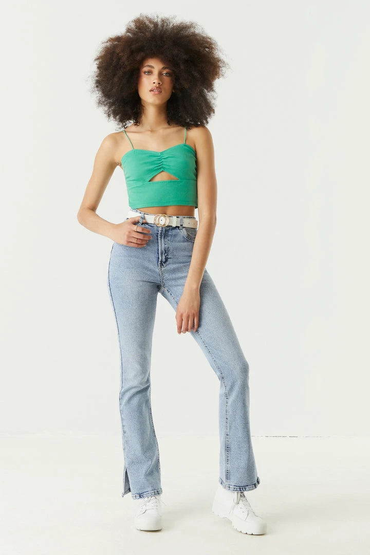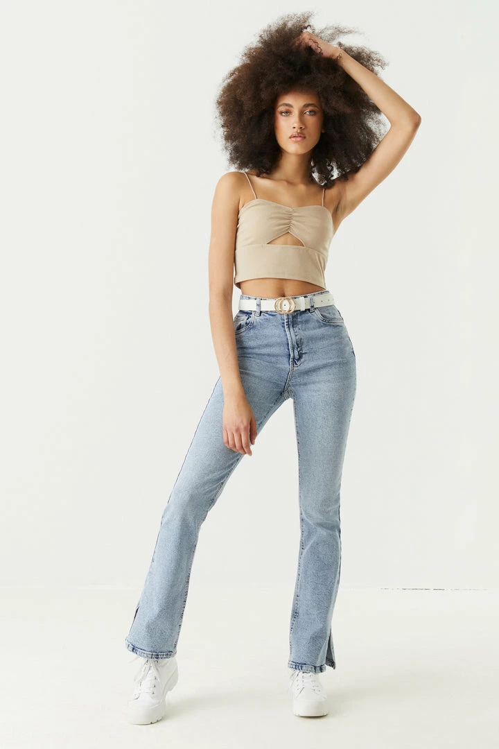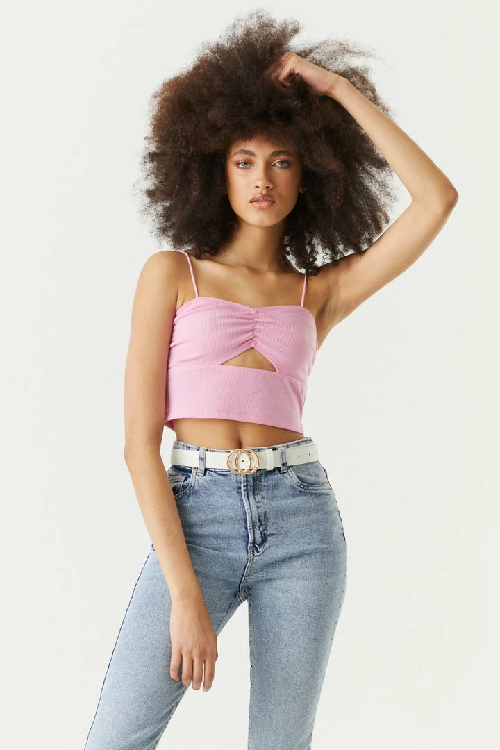 Cropped cut-outs are the hottest fit of the season! Test drive this top and you’ll want one in every colour. This cami features ruched bust, bungee straps, cropped fit and center cut-out. Size Runs Small.