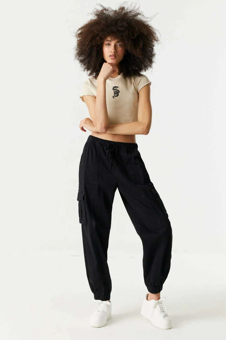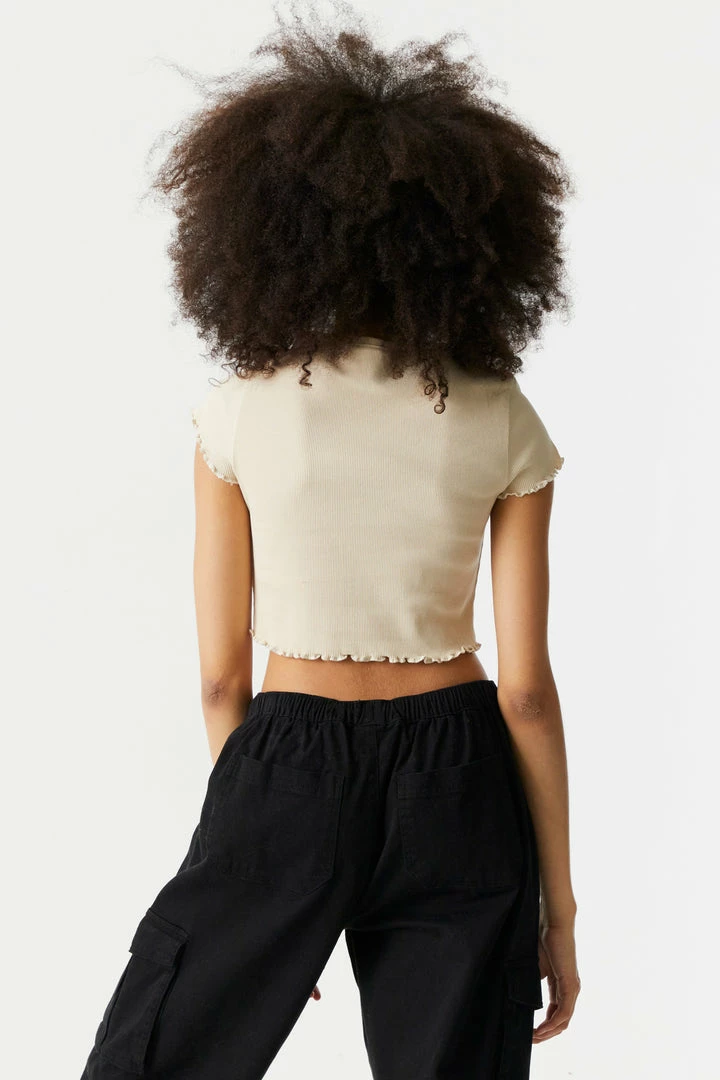 Make sure you get your daily dose of veggies with this lettuce hem tee! An essential part of any balanced outfit. This t-shirt features cropped fit, embroidered front graphic, short sleeves, crew neck and lettuce hem. Size runs small.