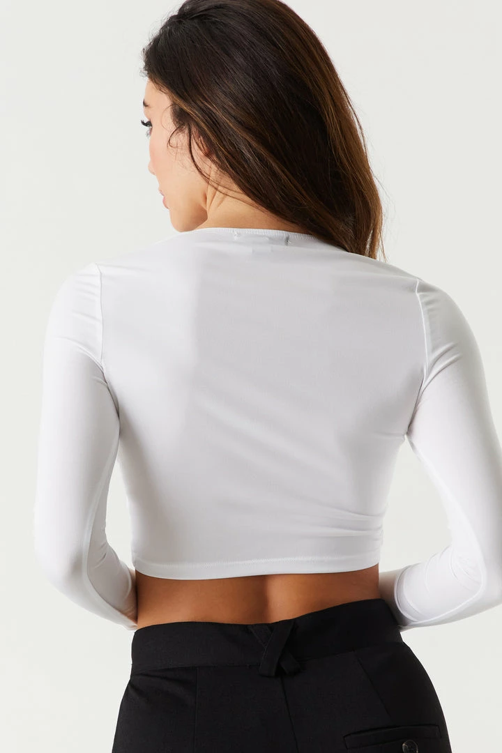 Bare a little by raising the hemlines with this eye-catching tiny top! This top features a front cut-out strappy design with ruching, long sleeves and a cropped length. Size Runs Small.