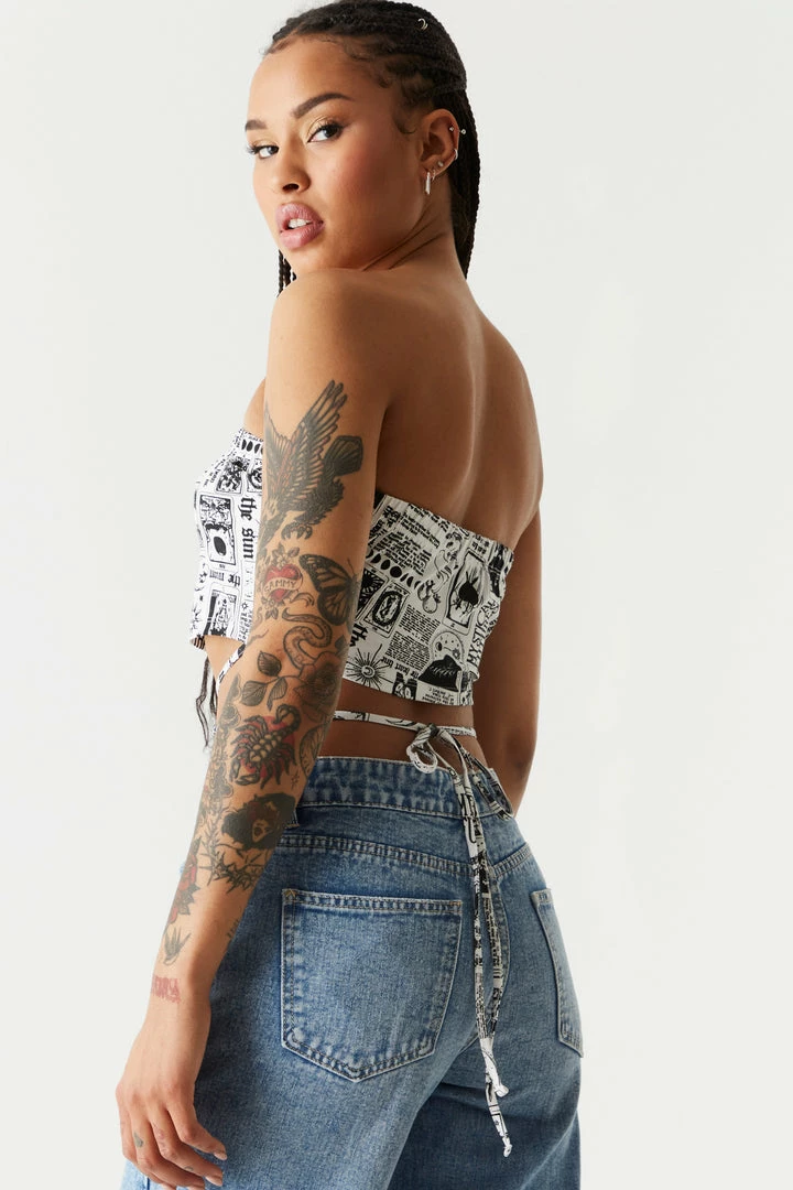 Let your top do all the talking with this sleeveless statement crop. Wrapped up like a bow, you’ll be the talk of town with out saying a word. This tube top features a secure elasticized cinched neckline, all over print, and ultra soft wrap detail. Size Runs Small.