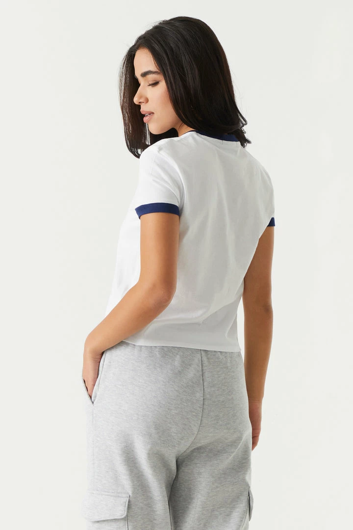We are getting some serious 70’s summer camp vibes from this vintage inspired tee. Travel back to a more stylish time with this fun fit. This t-shirt features contrast trim, ringer style, short sleeves, crew neckline and front graphic. Size runs small.