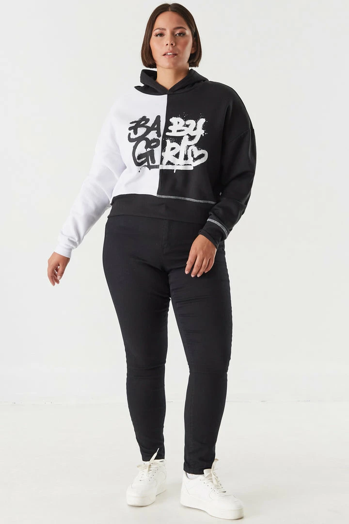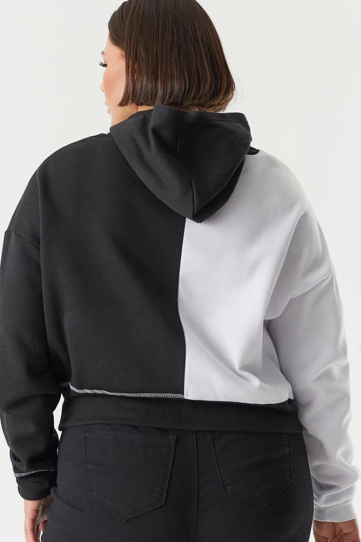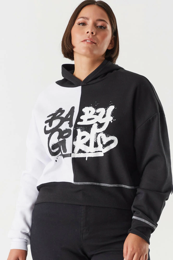 Have a slice of the spliced trend! Get the best of both worlds with two colours in this hoodie. This hoodie features a fleece interior, spliced colour block design, front graphic, hood and a cropped design.