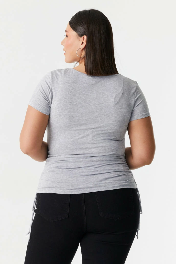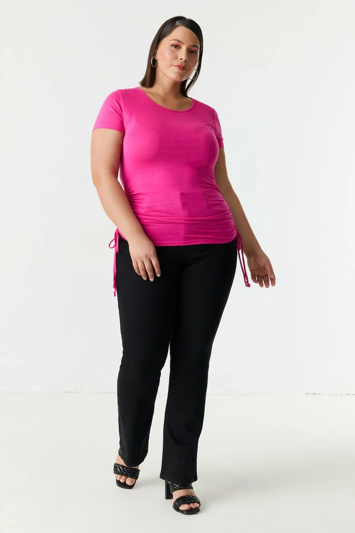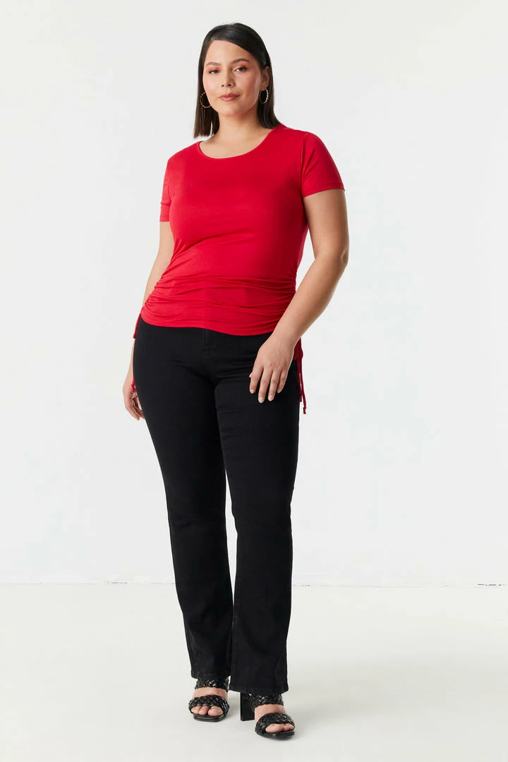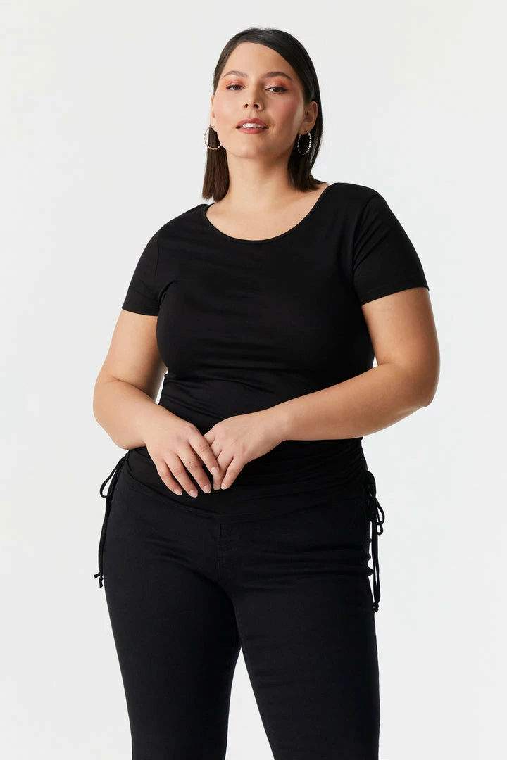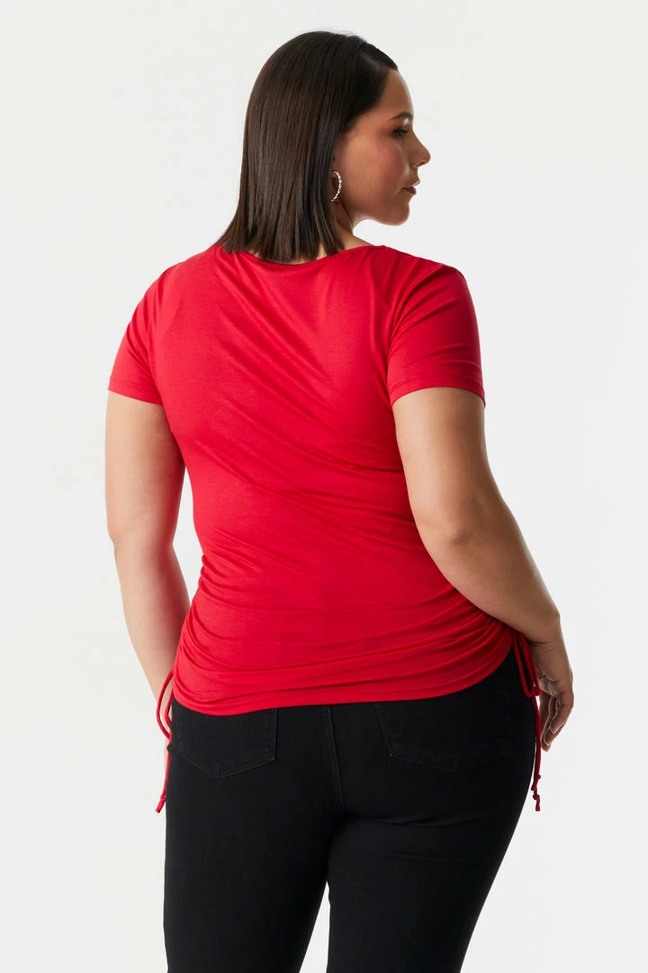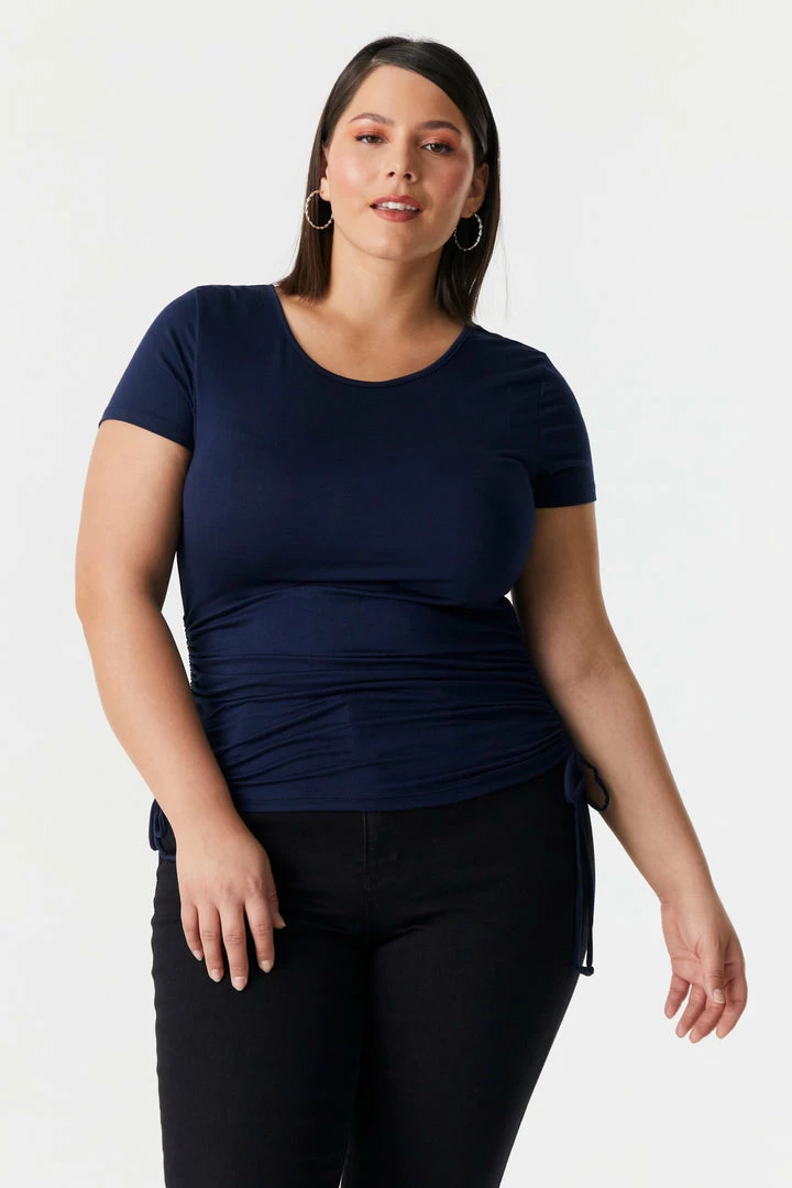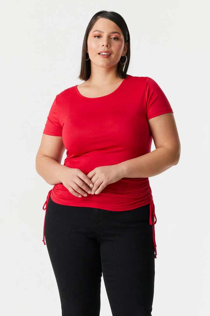 Rotate this ruched tee into your go-to top collection for a fun twist on a favourite fit. This t-shirt features scoop neckline, short sleeves and self-tie ruched sides. Size Runs Small.
