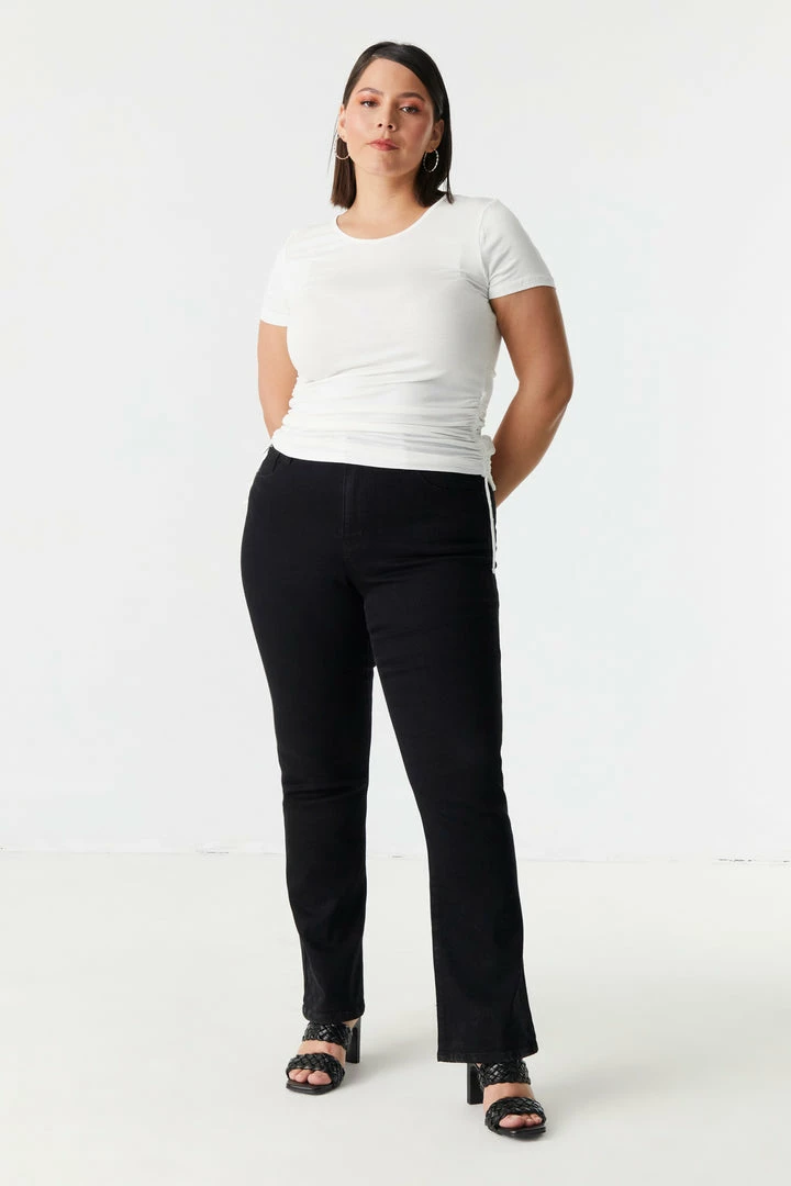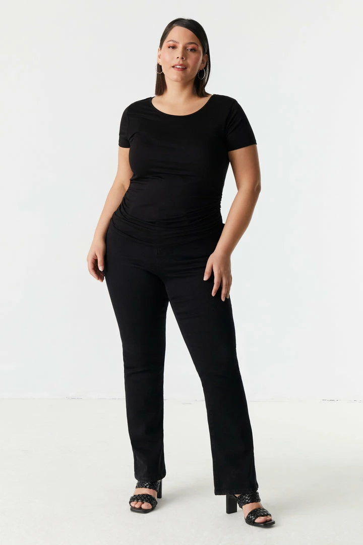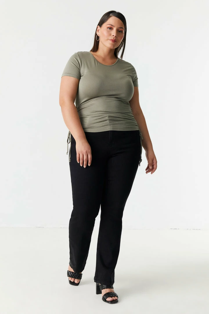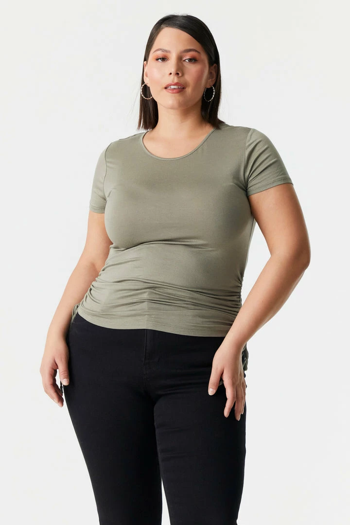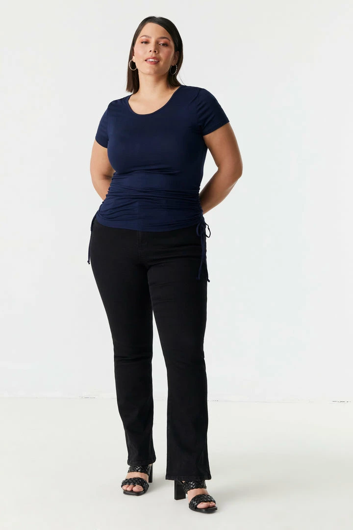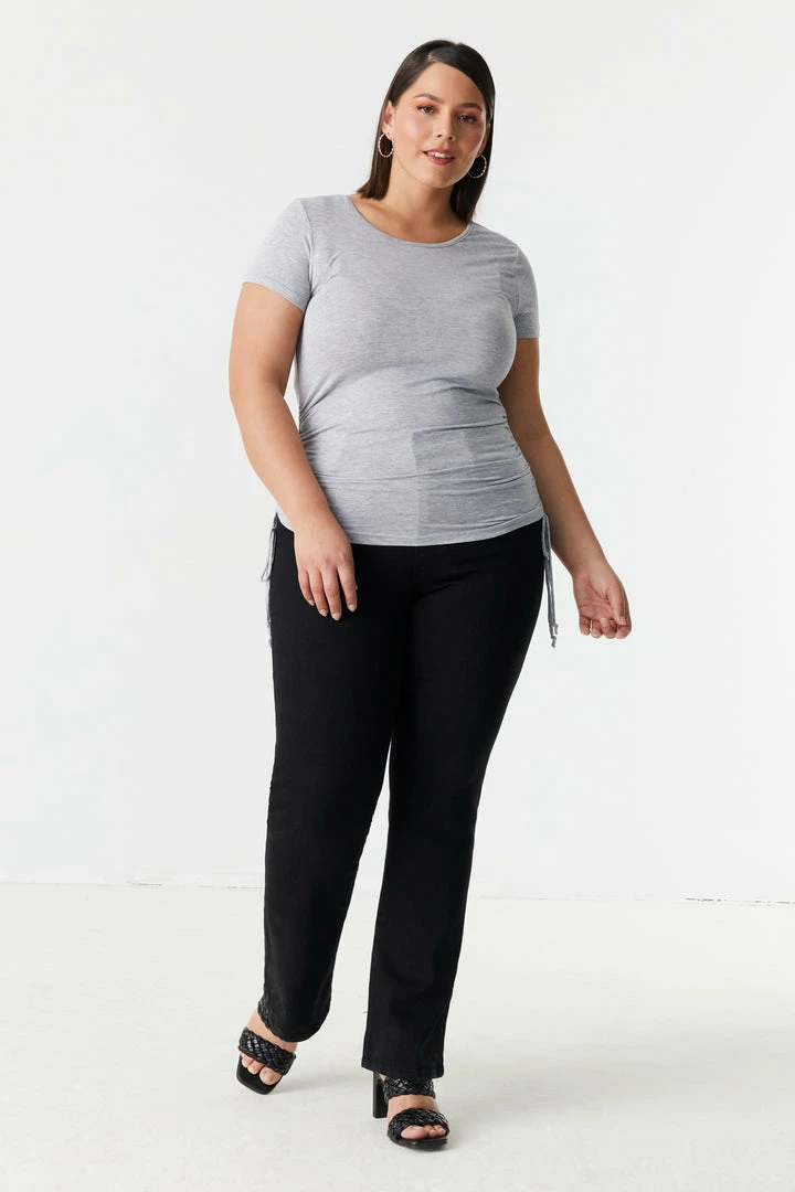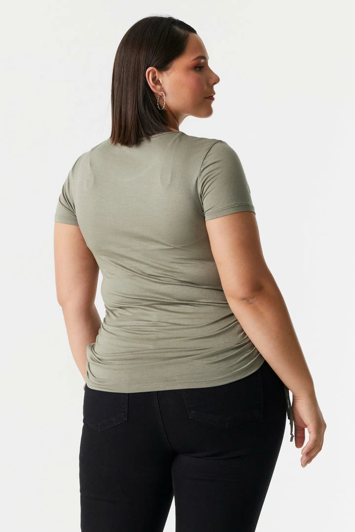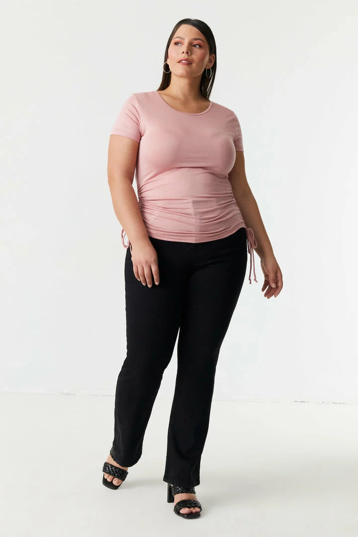 Rotate this ruched tee into your go-to top collection for a fun twist on a favourite fit. This t-shirt features scoop neckline, short sleeves and self-tie ruched sides. Size Runs Small.
