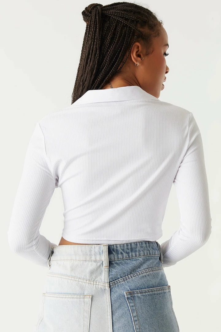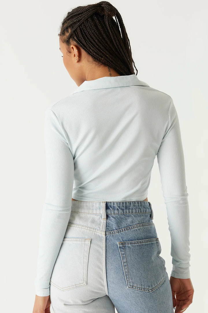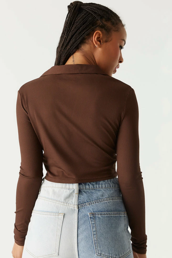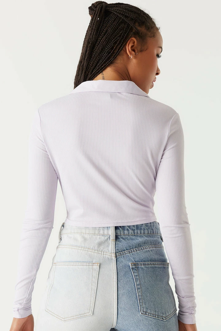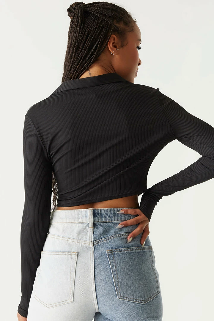 Crop it like it’s hot! Keep it short and sweet with a staple top. This top features a v-neckline, Johnny collar, ribbed knit material, long sleeves and cropped length. Size runs small.