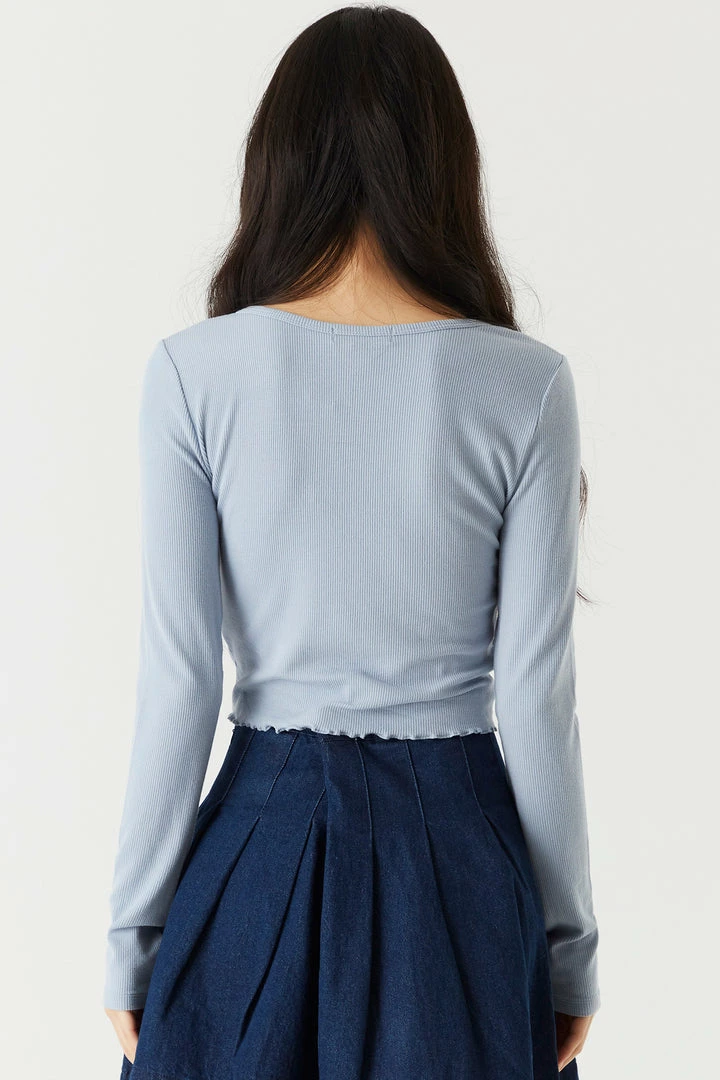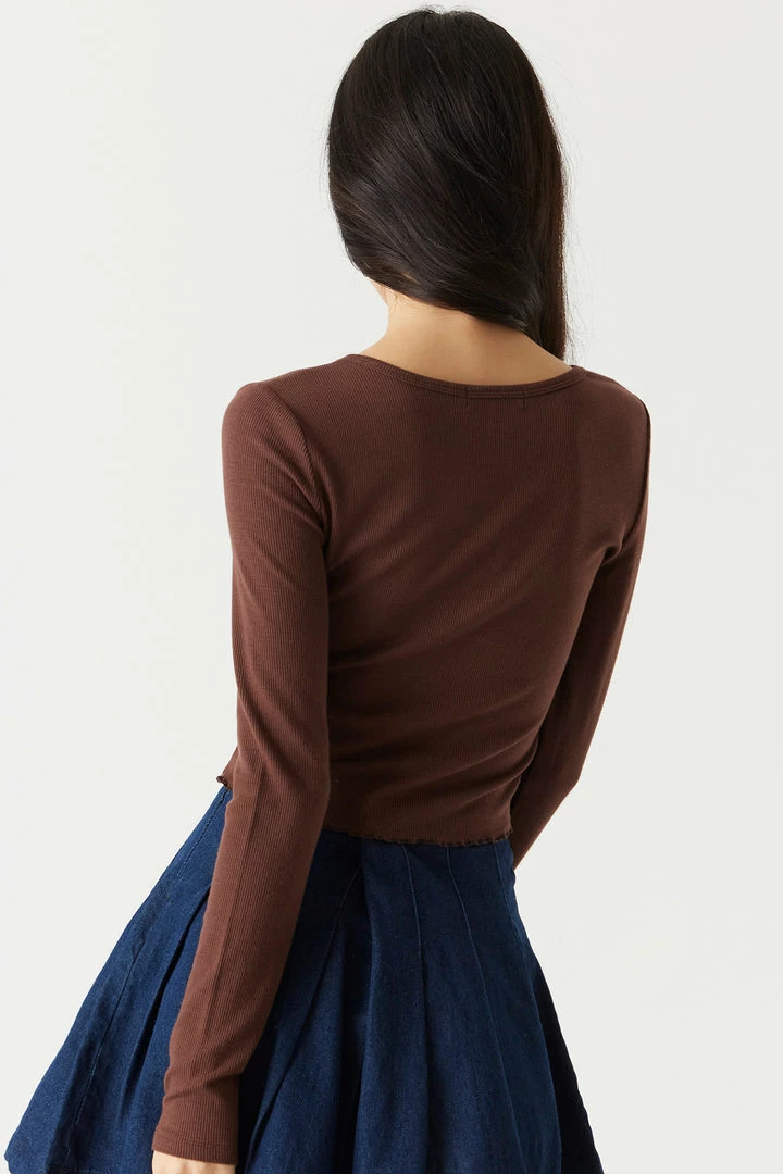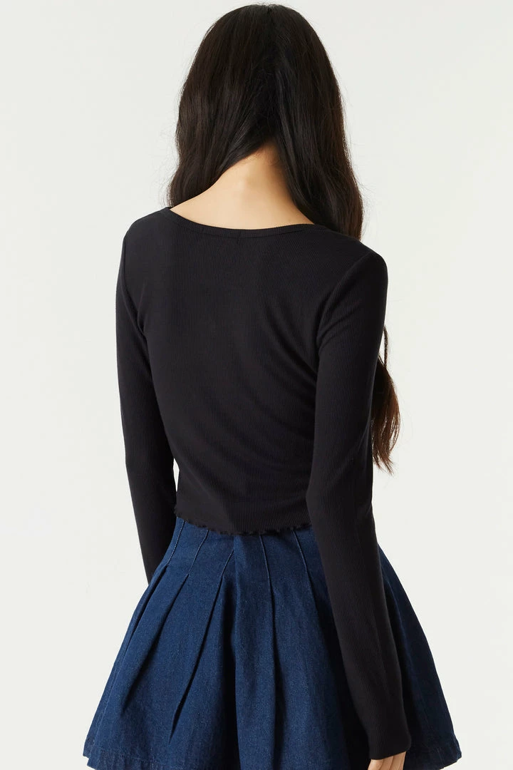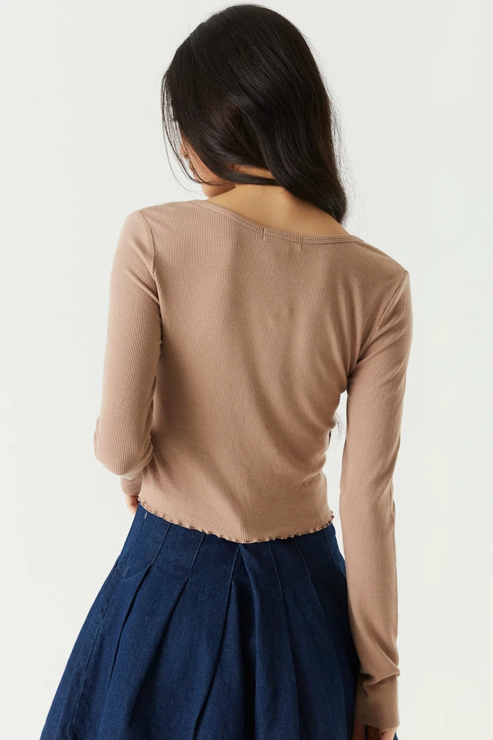 Spice up your basics with tops you’ll want to wear on rib-peat. This top features a notched neckline, ribbing, lettuce trim and long sleeves. Size Runs Small.
