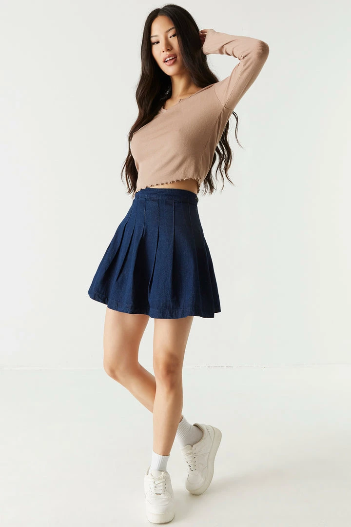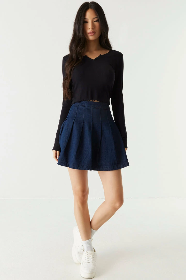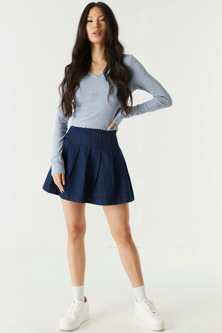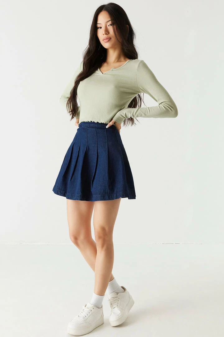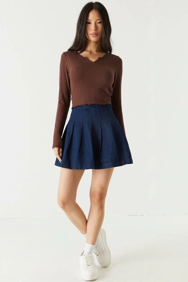 Spice up your basics with tops you’ll want to wear on rib-peat. This top features a notched neckline, ribbing, lettuce trim and long sleeves. Size Runs Small.