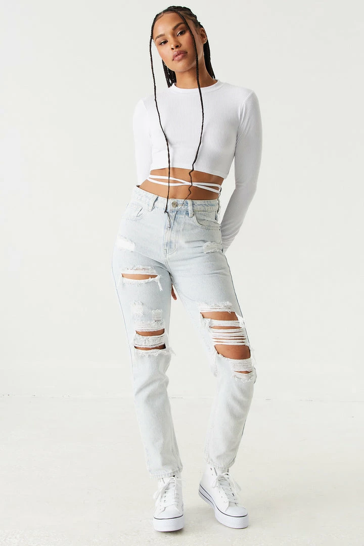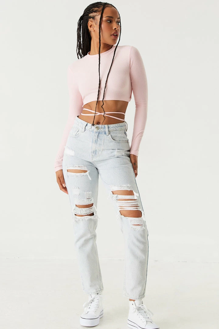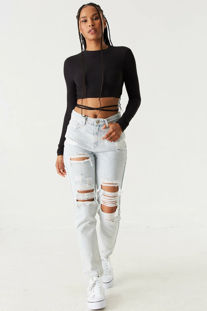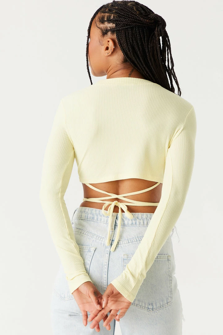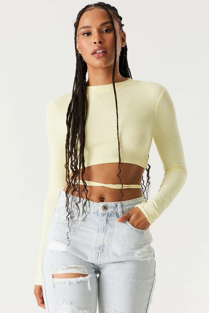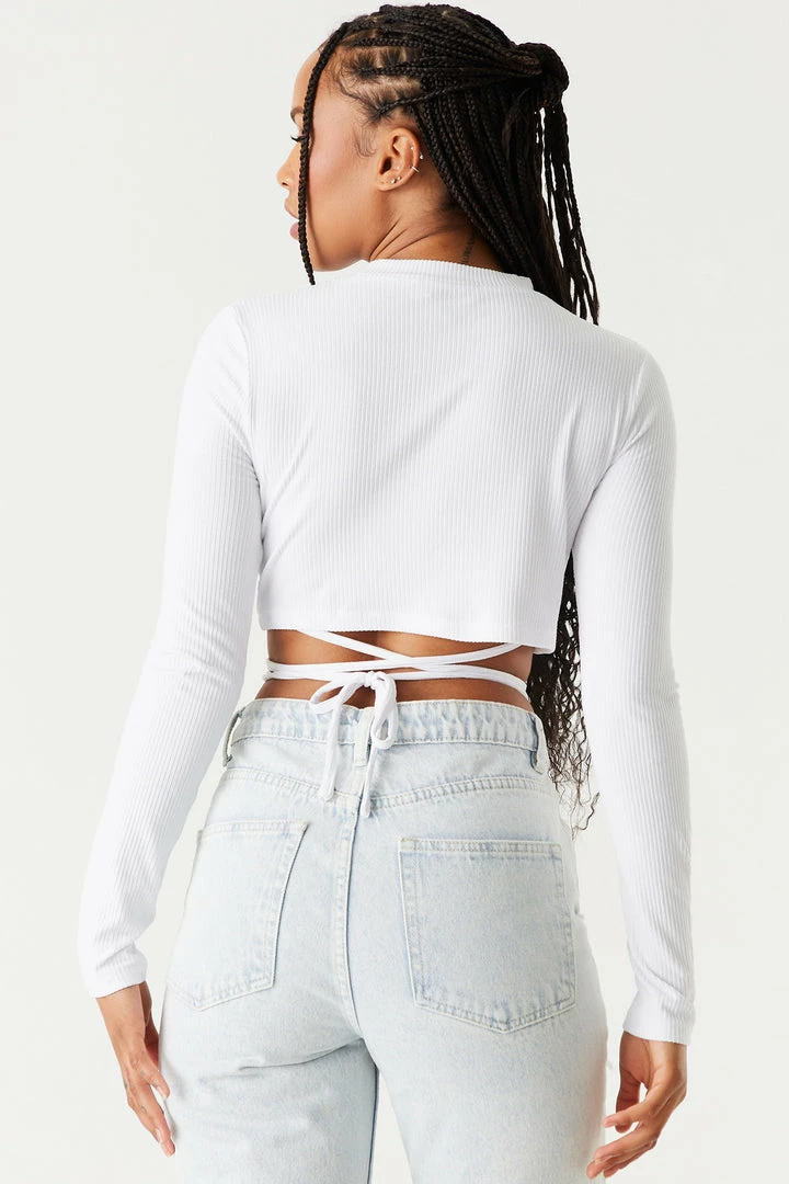 A stylish basic that’ll perfectly wrap around your figure! Pair this tiny top with your fave high-rise jeans to slay the school halls or the streets. This top features a crew neckline, ribbing, long sleeves and a wrap around tie detail. Size runs small.